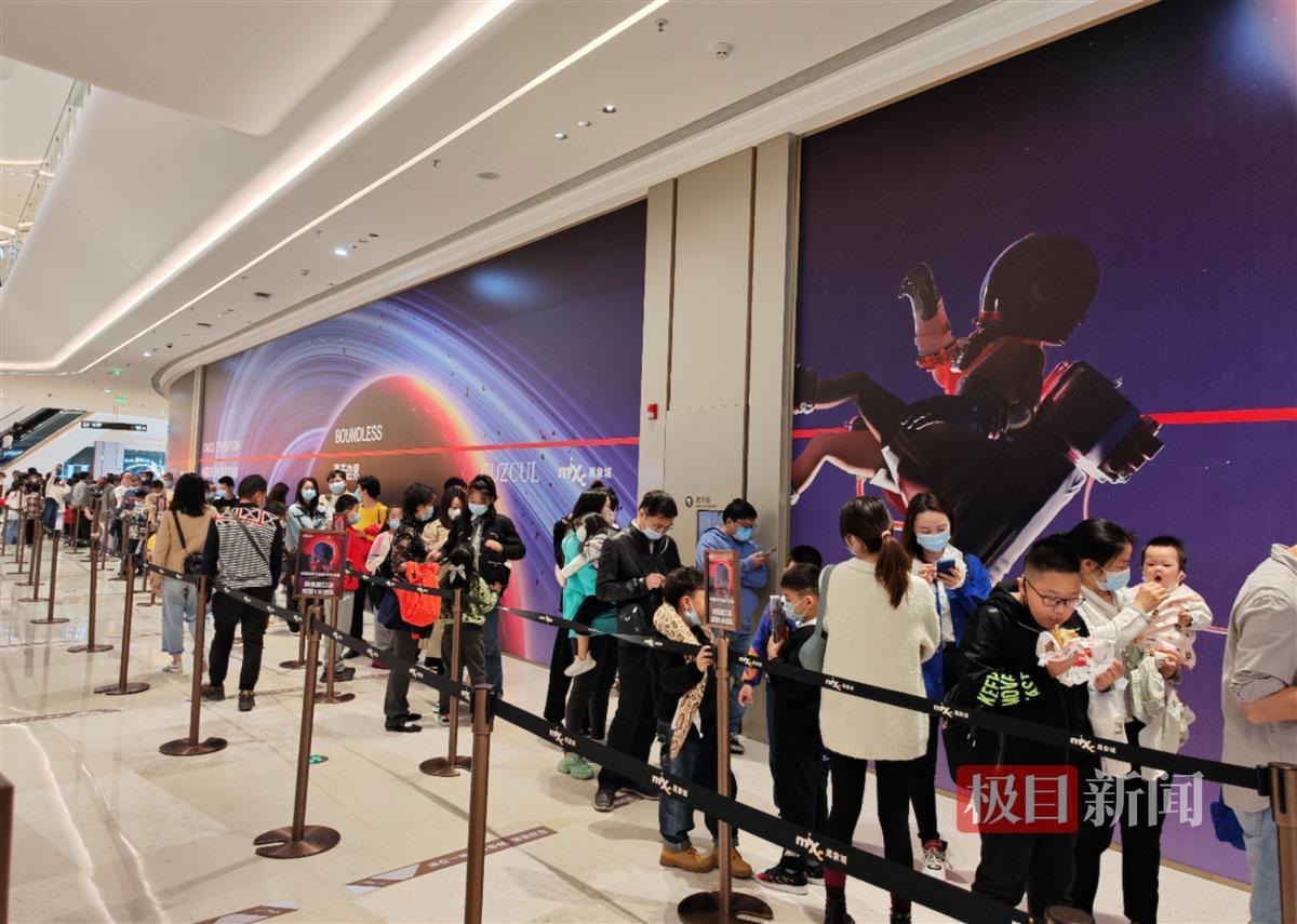 10月6日,在武汉万象城,极目新闻记者看到,《漫无边界》航天艺术展检票处,排起了长队,不少家长带着孩子,有序等候入场。