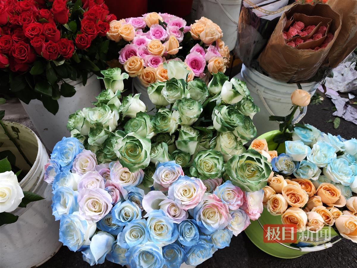 她所说的“碎冰蓝”,是一种玫瑰花:白色花瓣的边缘,染上了一抹浅蓝,看着清爽可人。“‘碎冰蓝’风靡后,我们又给同样的白玫瑰花瓣边缘染上红色、紫色、黑色等颜色,卖得也挺不错,这一类花也可以统称为‘碎冰蓝’。”一家花店店主介绍,“碎冰蓝”本质上就是白玫瑰,后期有加工,花瓣边缘喷的是特制颜料,不影响花期,也没有毒害,可放心购买。