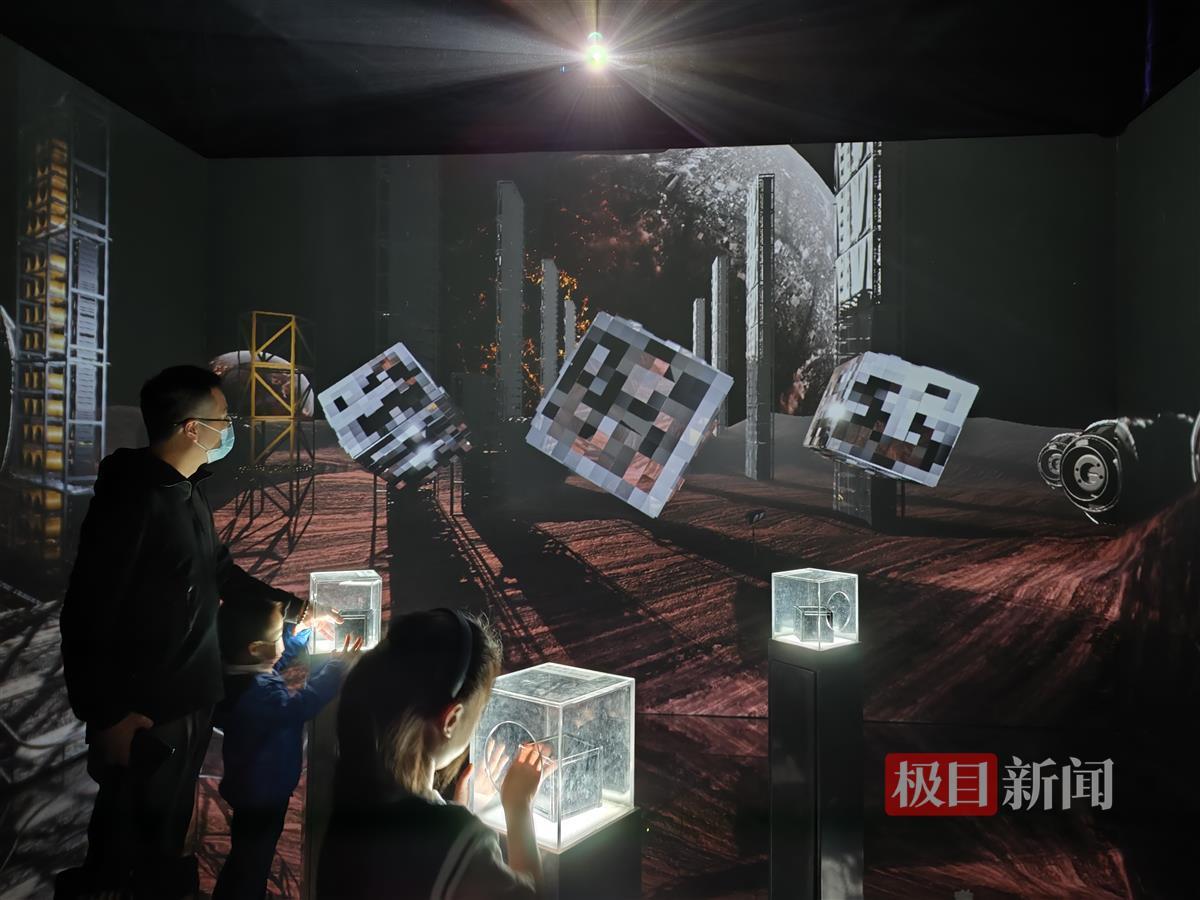 极目新闻记者购票入场后看到,这场航天展,有三大展馆、15个展区,观众可以沉浸式“穿越”火星、月球,蔚为壮观。一些适合孩子的光影、娱乐、迷宫等设计,也让不少亲子家庭有不错的休闲体验。