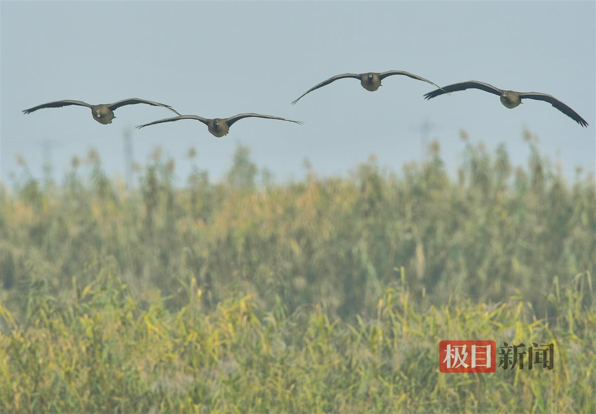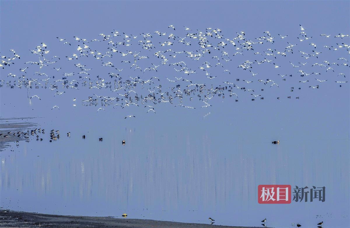沿途,志愿者们看到,数百只反嘴鹬团队翻飞出一片黑白鸟浪,非常震撼,普通鸬鹚组成人字队,一队队飞过,水中野鸭们悠哉地游来游去,空中翻飞、水中游弋,豆雁来个自由行……这就是原生态的大自然啊!