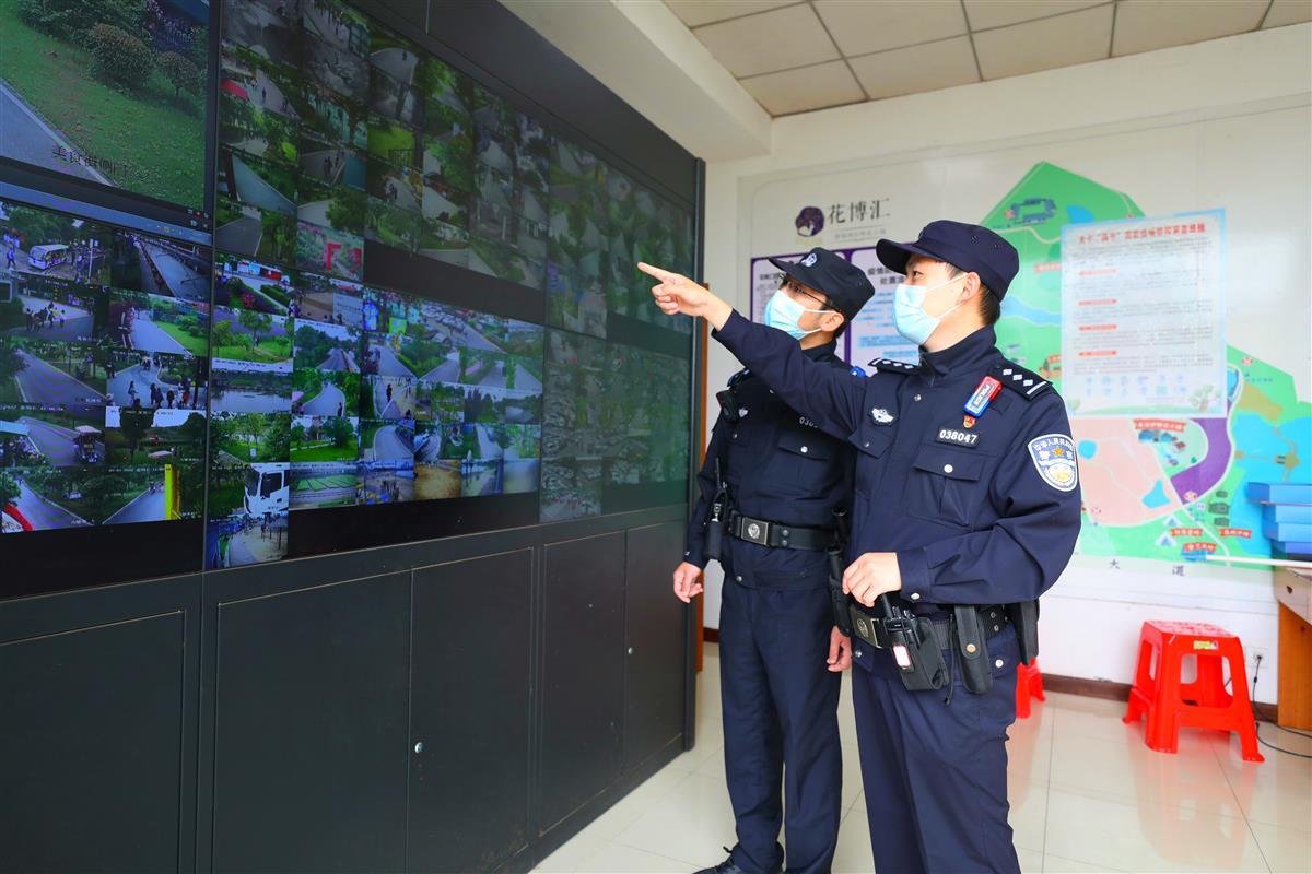 驻守花博汇景区民警辅警查看视频监控