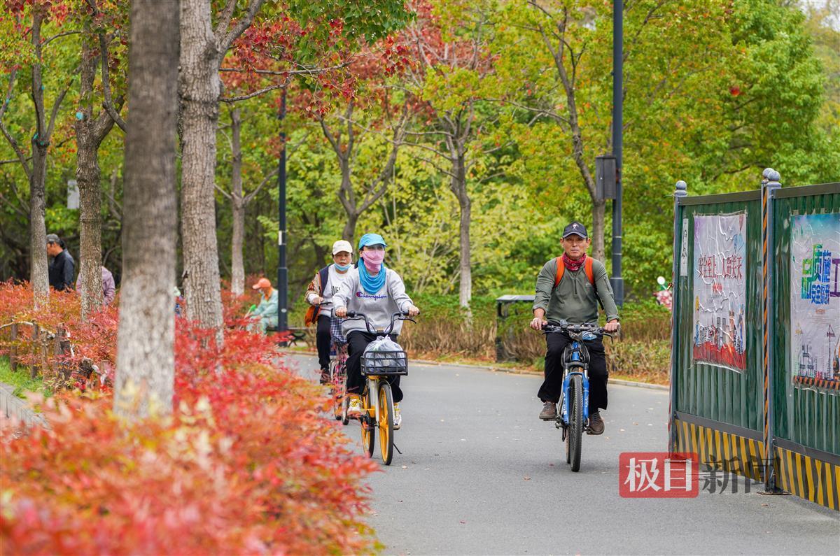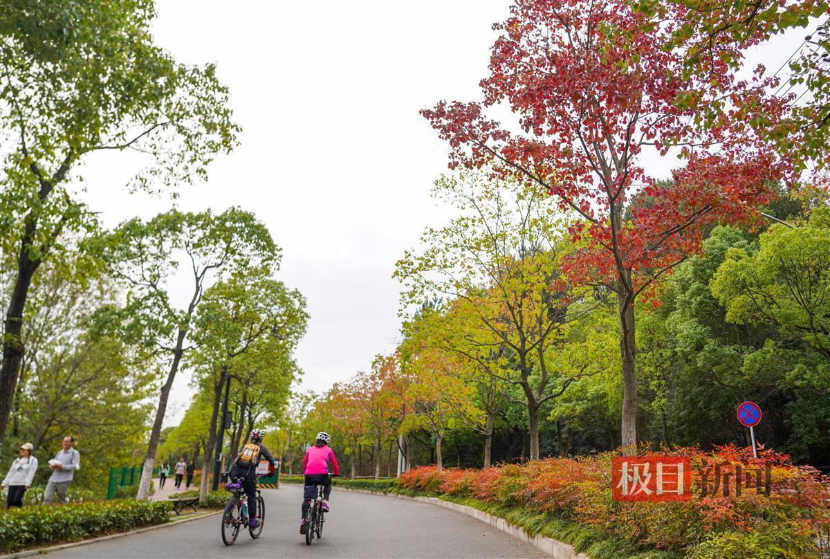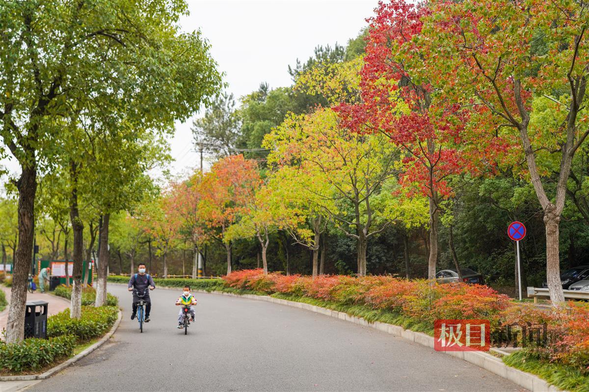 当天上午,记者现场看到,喻家湖路至团山路约千米长的弯道上,分布于机动车道与绿道两边的乌桕树约有200株,目前已有近一半的树叶已变红,不时有骑行和散步的市民停下脚步,欣赏这金秋的美景。