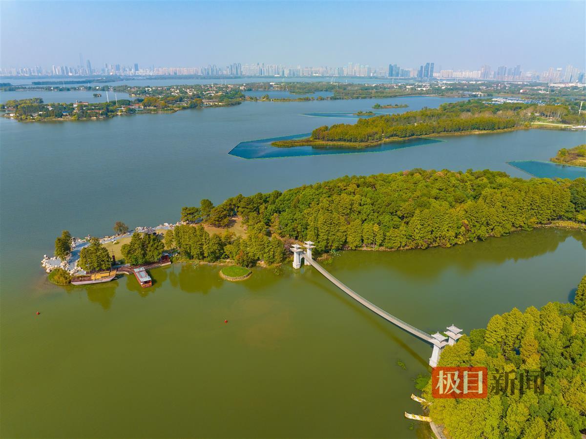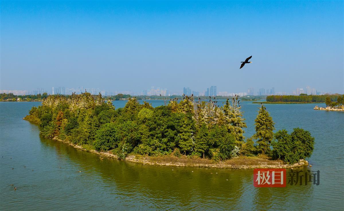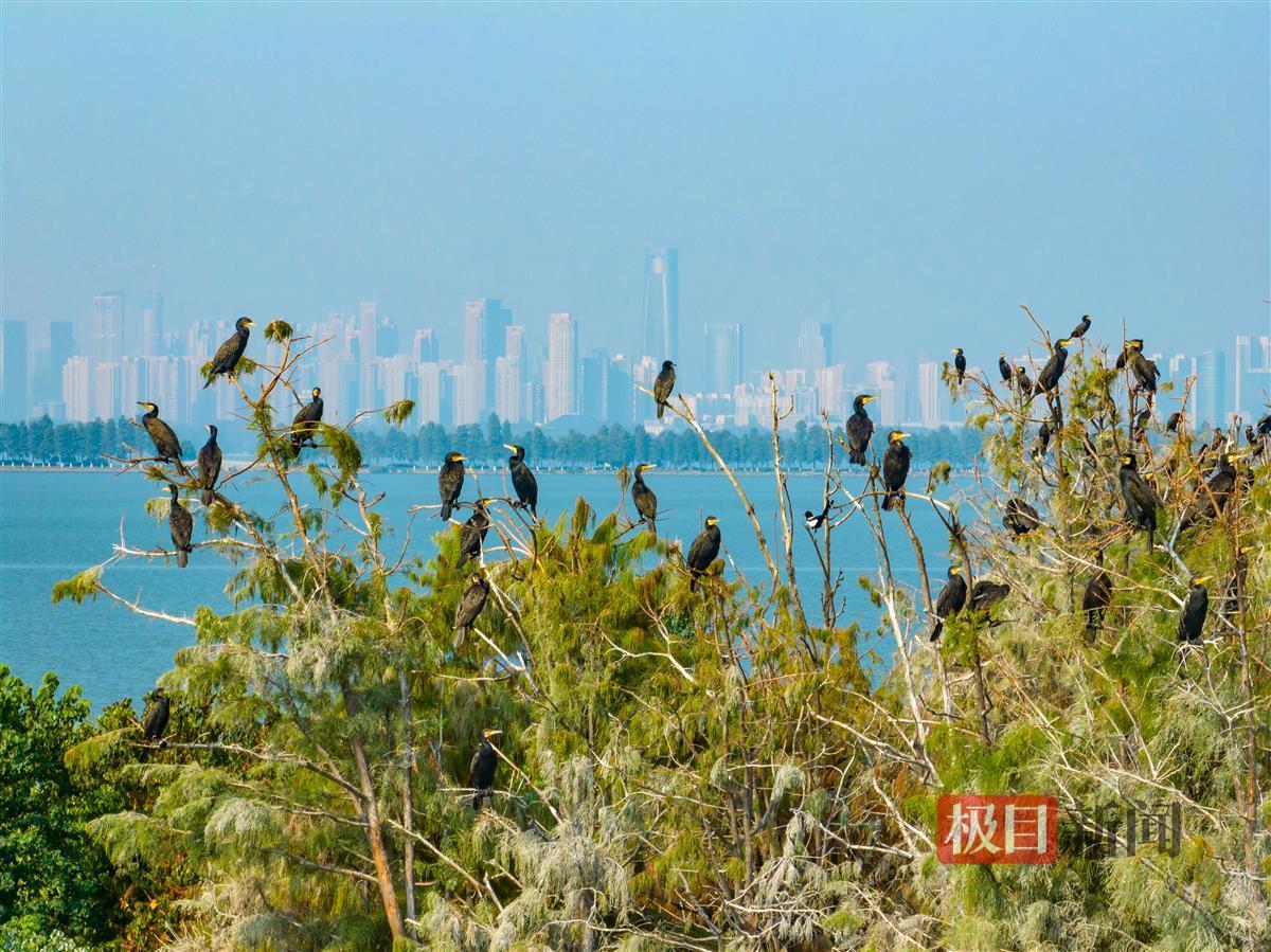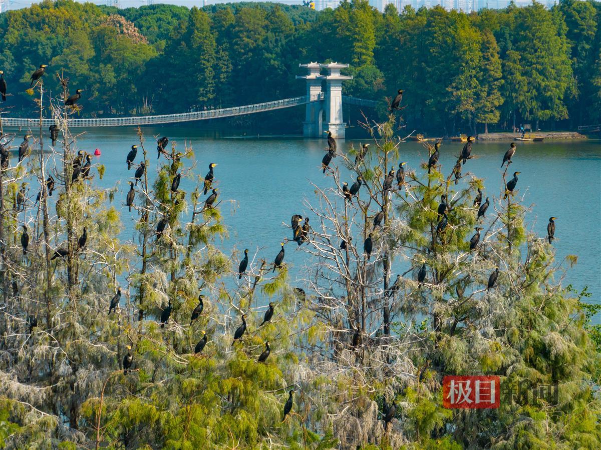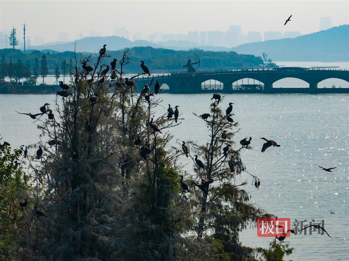 10月31日,武汉市东湖落雁景区“走人棋鸟岛”上,白余只鸬鹚或栖息枝头,或凌波掠食,与远处清河桥上的春秋第一神射手养由基雕塑相映成趣。