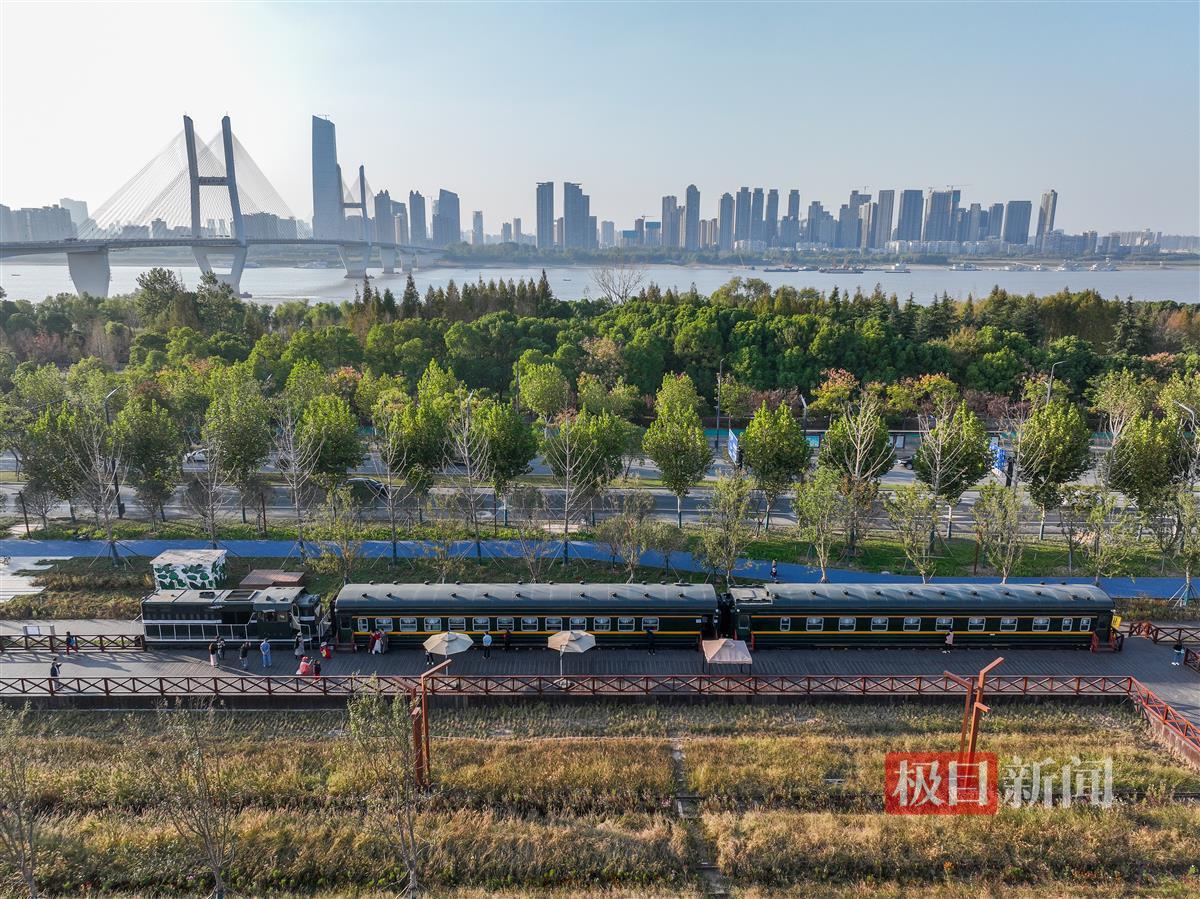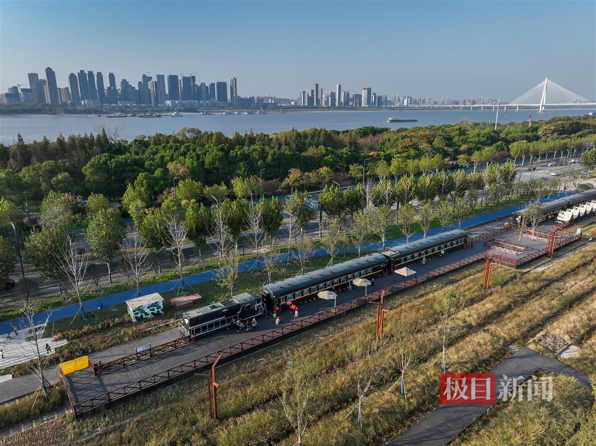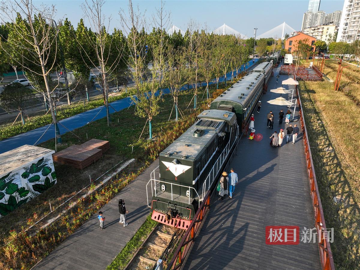 位于长江二桥下的武汉绿皮火车公园前期工程近日已完成并对外开放。10月31日,天气晴好,“网红绿皮小火车”吸引了不少市民前来拍照打卡,感受怀旧复古的慢生活。