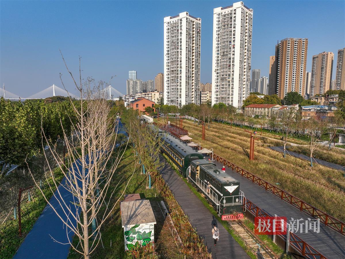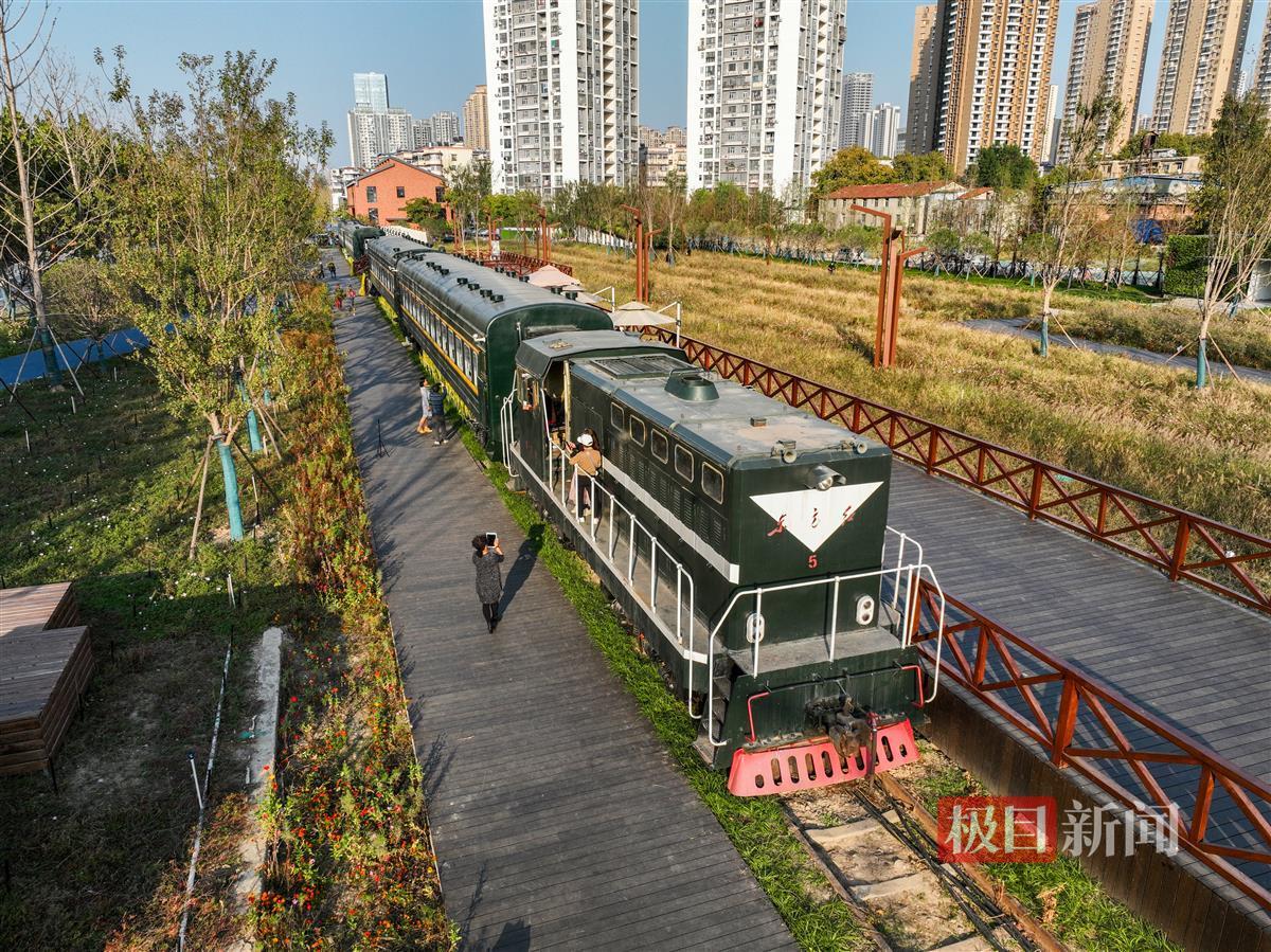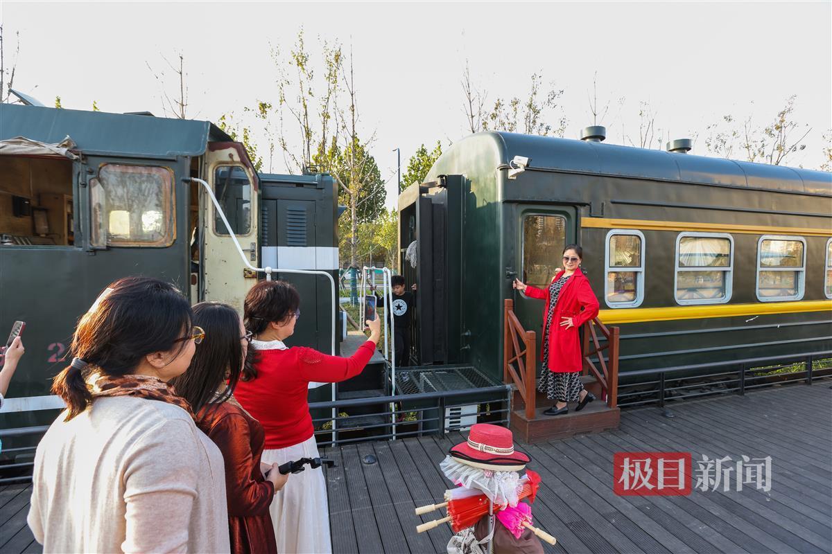位于长江二桥下的武汉绿皮火车公园前期工程近日已完成并对外开放。10月31日,天气晴好,“网红绿皮小火车”吸引了不少市民前来拍照打卡,感受怀旧复古的慢生活。