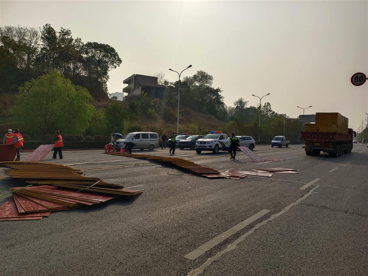 赵言介绍,他和同事立即下车引导货车停至路边,疏导交通,协助搬运马路上的木板。很快,交管部门立即在现场摆放锥桶和反光标志,规范设置警戒区。佛祖岭街道综合执法中队和保洁人员客串“搬运工”,将路中的260块木板搬到路边,及时消除了安全隐患,恢复了交通,前后过程仅持续五分钟左右。