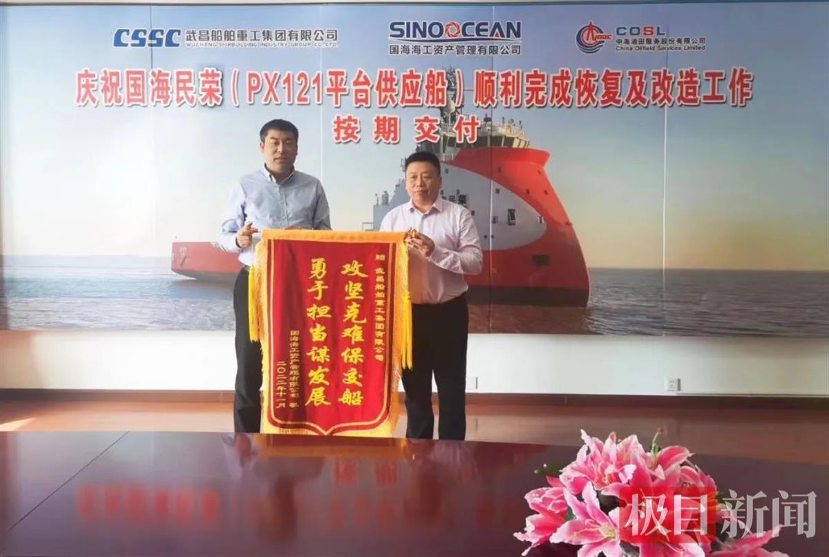 今年2月,国海公司与中海油服、武船集团相继签署了涉及“国海民祥”、“国海民乐”、“国海民荣”、“国海民耀”4艘PX121H型平台供应船的光船租赁合同。此次“国海民荣”轮的交付,标志着国海海工管理的武船集团旗下库存海工装备处置工作已全部收官。