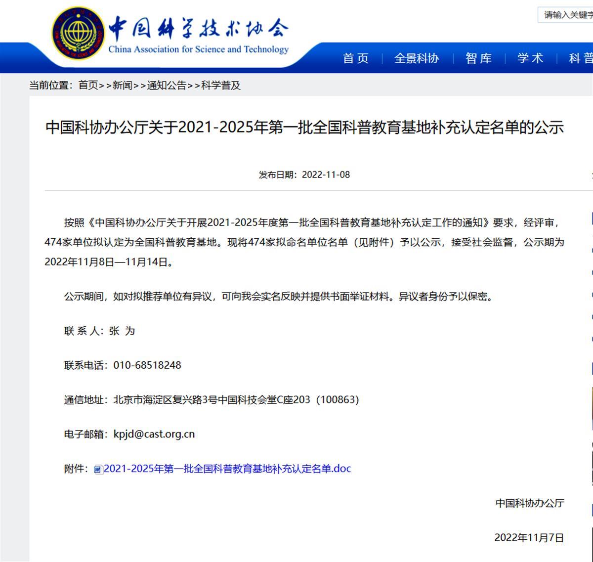 中国科学技术协会网站相关公示截图