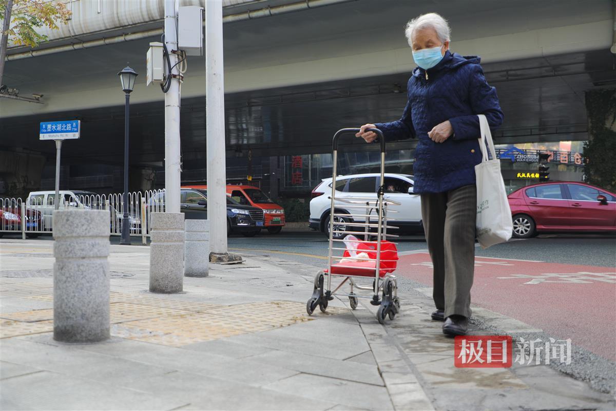 11月17日,在武汉市汉阳区墨水湖北路汉桥路路口,一位婆婆拖着装有菜和食物的小车,顺利从无障碍道路上通过,老人笑了:“道路的坎子修平了,再也不用抬车子了。”