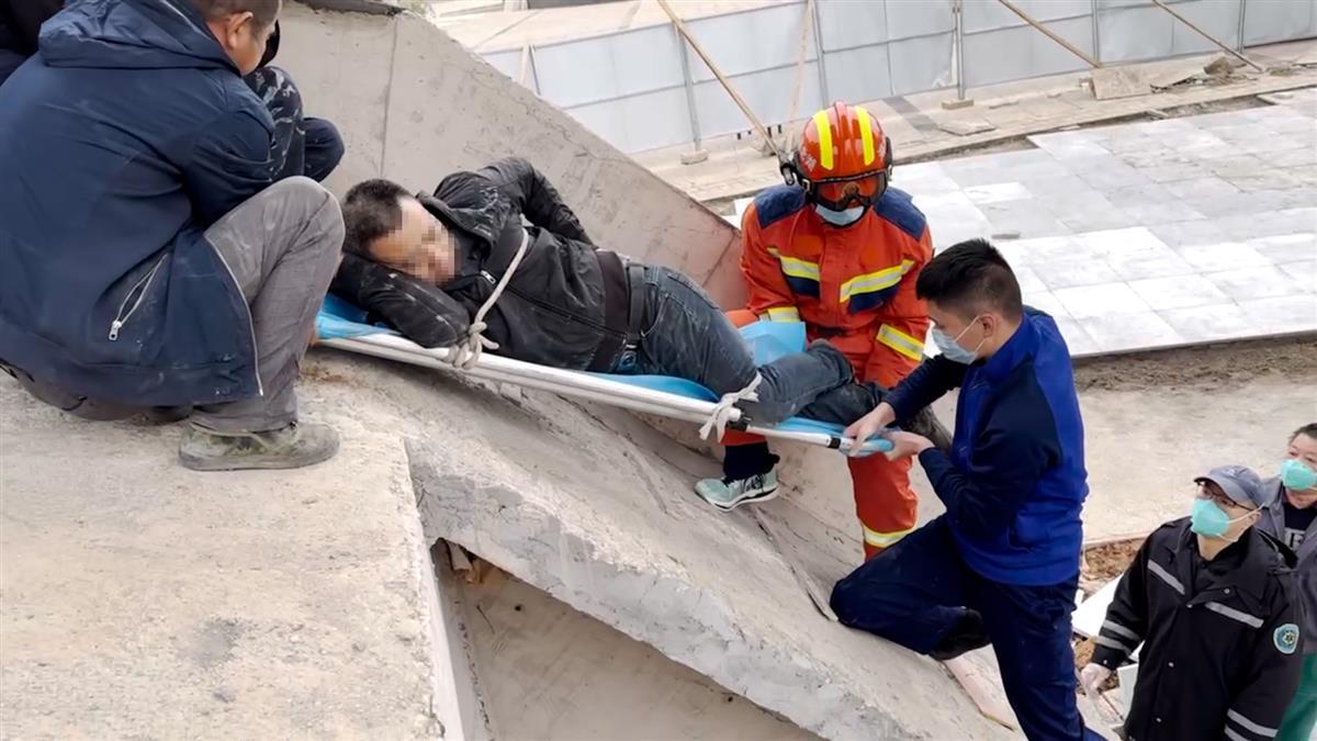 了解情况后,消防员立即携带担架、安全绳等救援工具前往平台施救。两名消防员配合工友将男子抬上担架,并使用安全绳将其固定,随后抬往通向地面的斜坡处,另外两名消防员跨跪在斜坡上小心地传递担架,120医护人员和其他工友则在地面接应。经过近10分钟的救援,男子被成功转移至救护车上并送往医院救治。