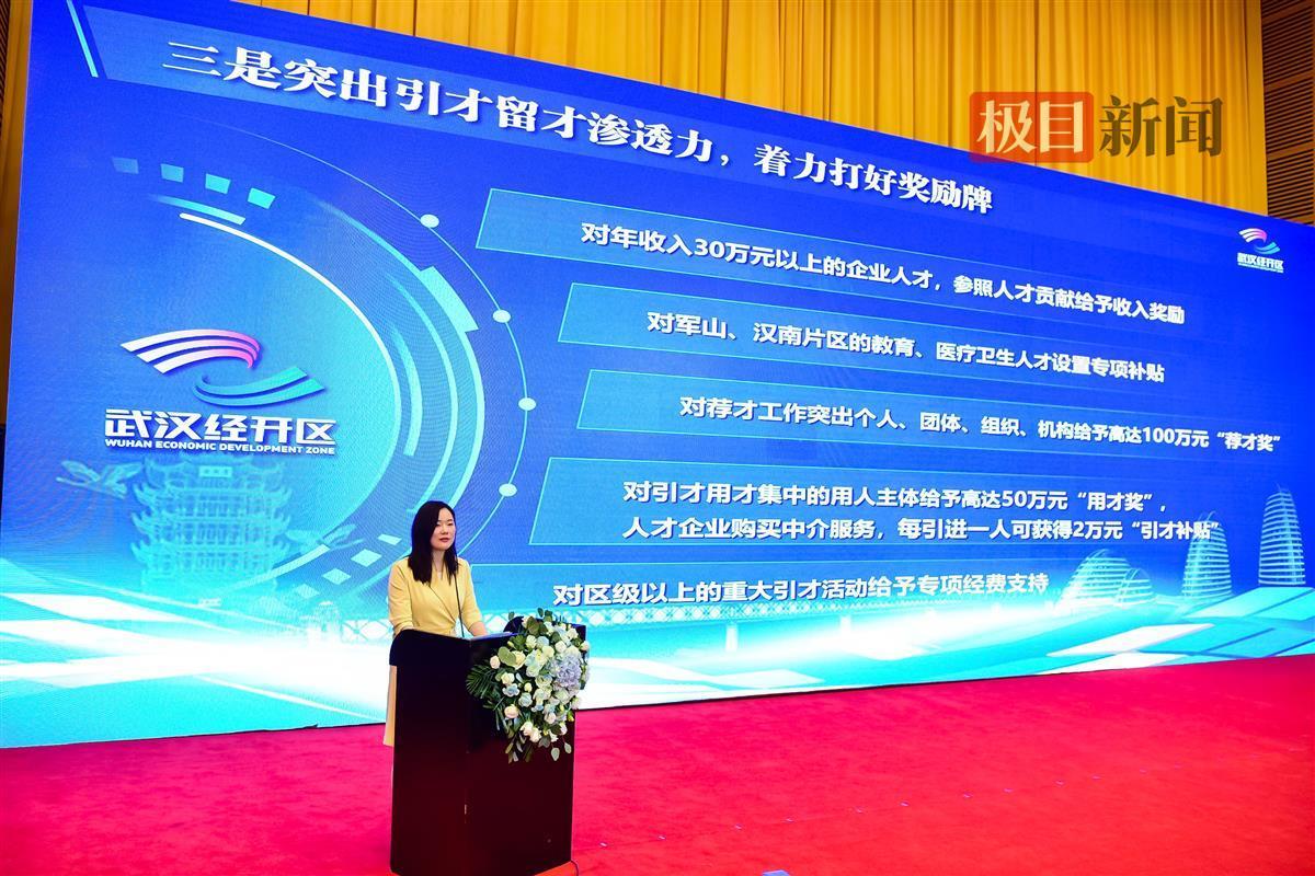 专场活动上,武汉经开区人力资源局副局长钟芸推介了被誉为“黄金十条”的《人才强区战略3.0》,这项政策包含10条实施意见、20个子细则、4部配套实施方法。