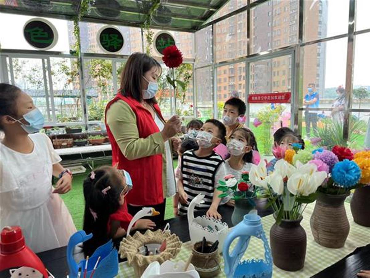志愿者刘叶在空中花园与小朋友们互动