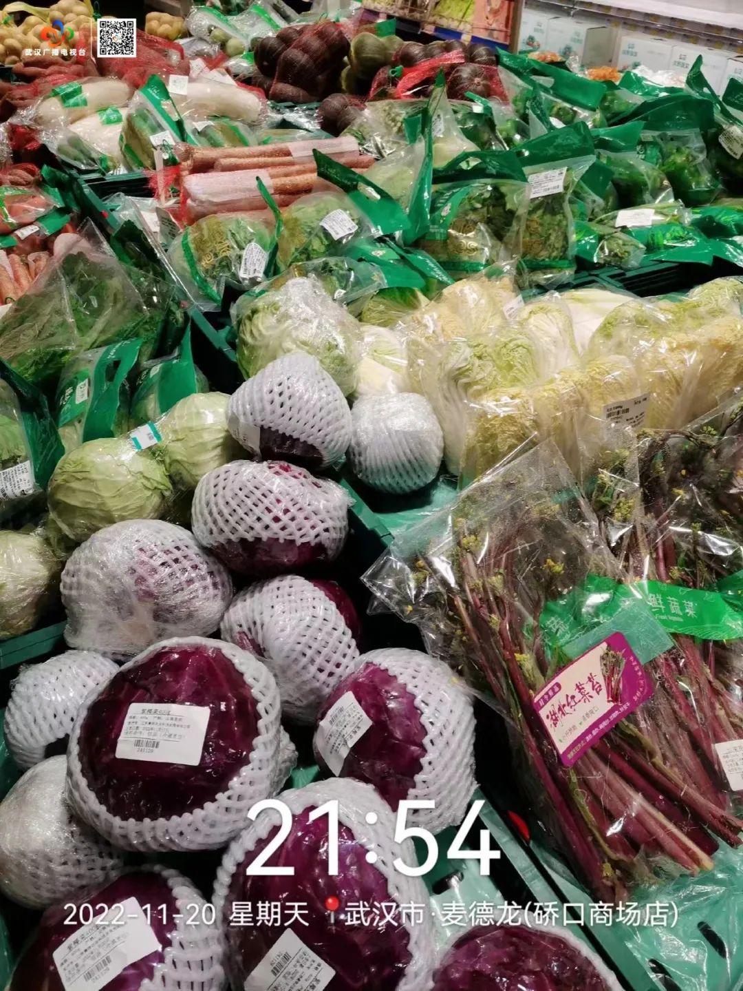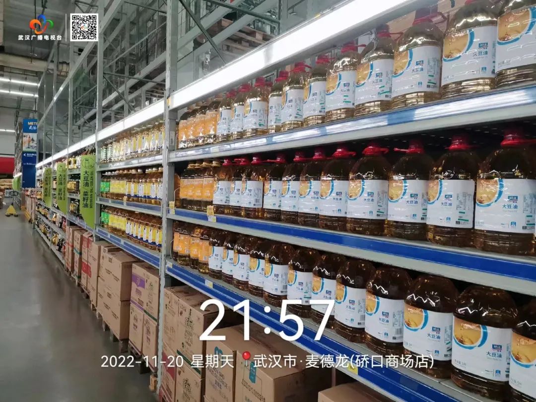 11月20日晚上9:50,经过紧急调度调配,麦德龙硚口店内的货架又是满满当当的,店内生鲜区、果蔬区、肉品区域以及深受孩子们喜爱的面包与牛奶区域货品齐全,当晚为了配合市民购买生活物资,店内将营业时间延长至晚上11:00。