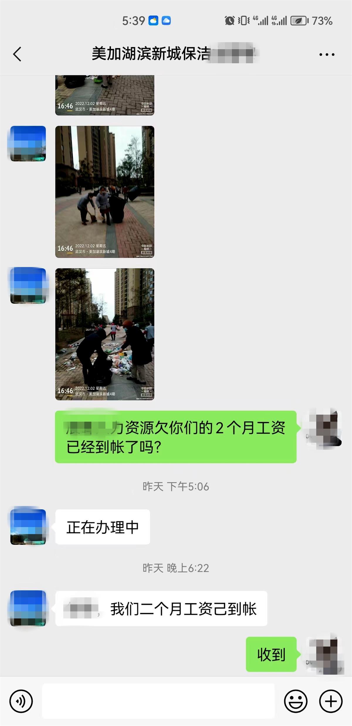 傍晚6点多,李女士微信回复记者,保洁人员9月、10月工资已经到账,保洁服务提前恢复了。