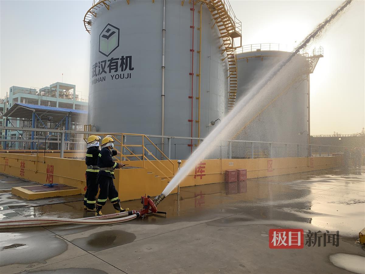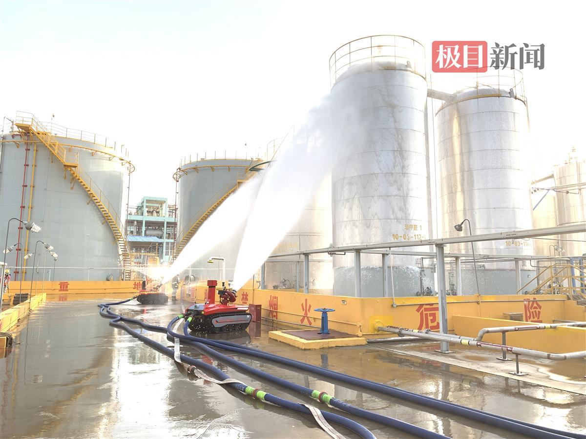 12月13日下午,两台灭火机器人拖着长长的水带,缓缓驶入位于武汉市青山区化工园区的武汉有机实业有限公司危险化学品罐区,盯准模拟“着火点”,打开水炮。水柱喷涌而出,隔离水幕迅速构建,“火势”蔓延趋势得到有效控制。