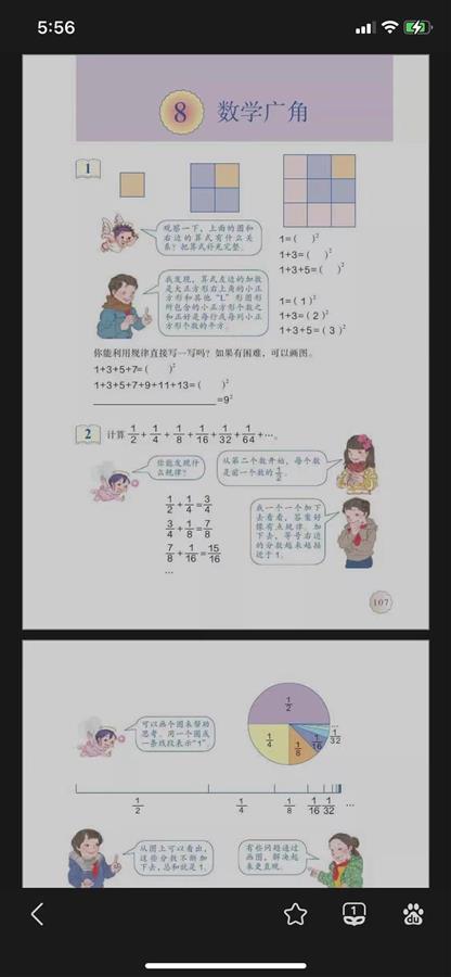 程先生的儿子程启就读于晴川实验小学,父子俩说的这道题,是六年级上册第八单元《数学广角》中的第二道例题(如上图所示):计算1/2+1/4+1/8+1/16+1/32+1/64+…。课本中借助圆和线段两种画图方式证明,“这些分数不断加下去,总和就是1。”程启认为问题就出在结论上。