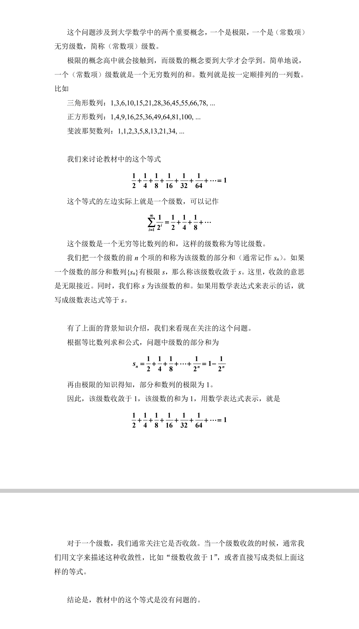 教材中出现的表达式1/2+1/4+1/8+1/16+1/32+1/64+…就是一个级数。它是一个无穷等比数列的和,这样的级数称为等比级数。
