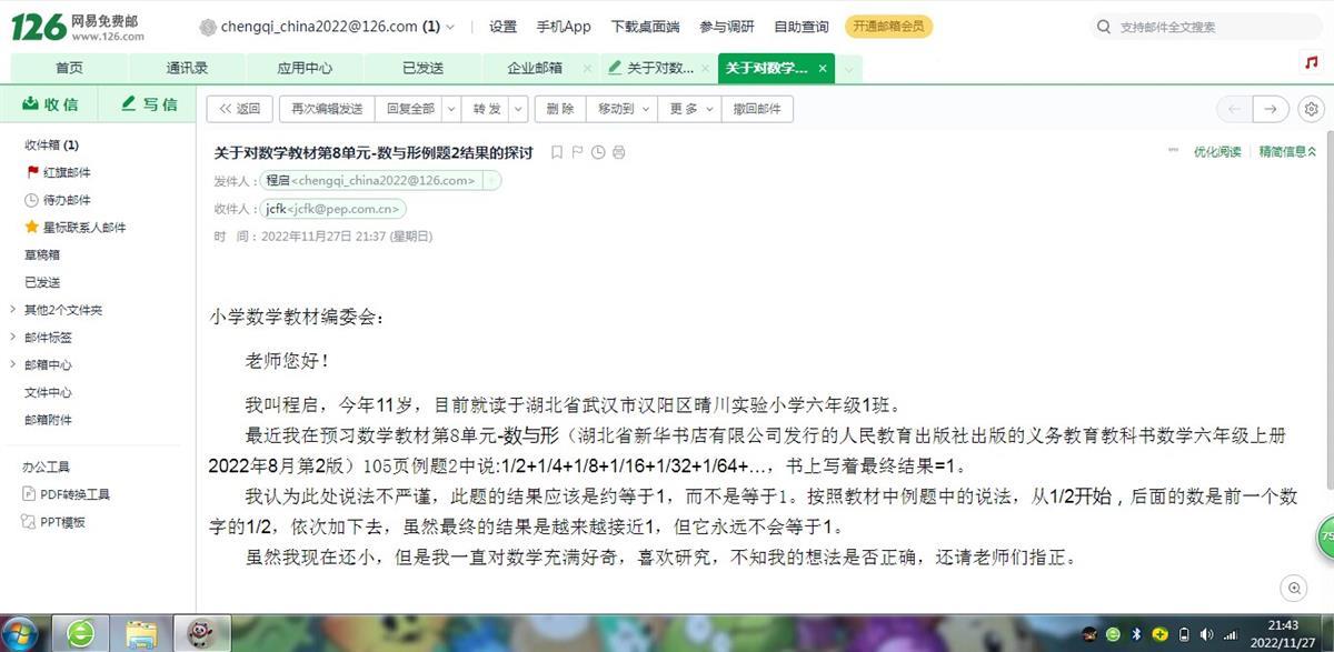 程先生和儿子探讨后,十分支持孩子的观点。他认为,无论是从逻辑推理还是数学计算上来说,这组数列若继续加下去,答案应当是无限接近于1,但永远不等于1。程启在网课时曾向数学老师提问,老师称需要查阅资料后回答。