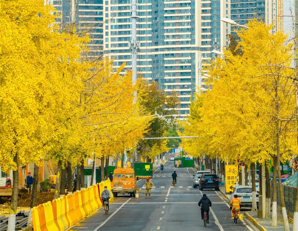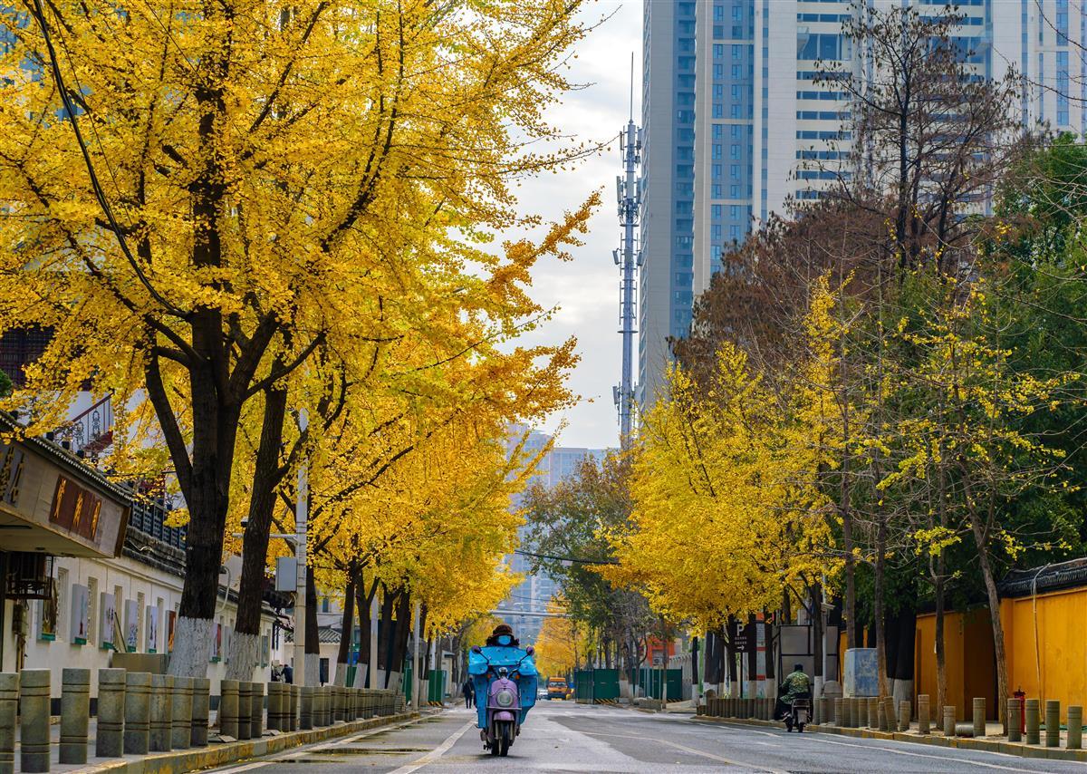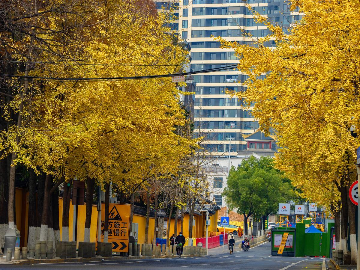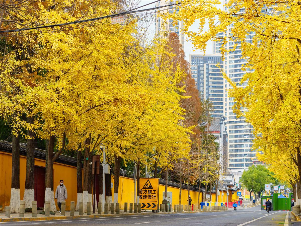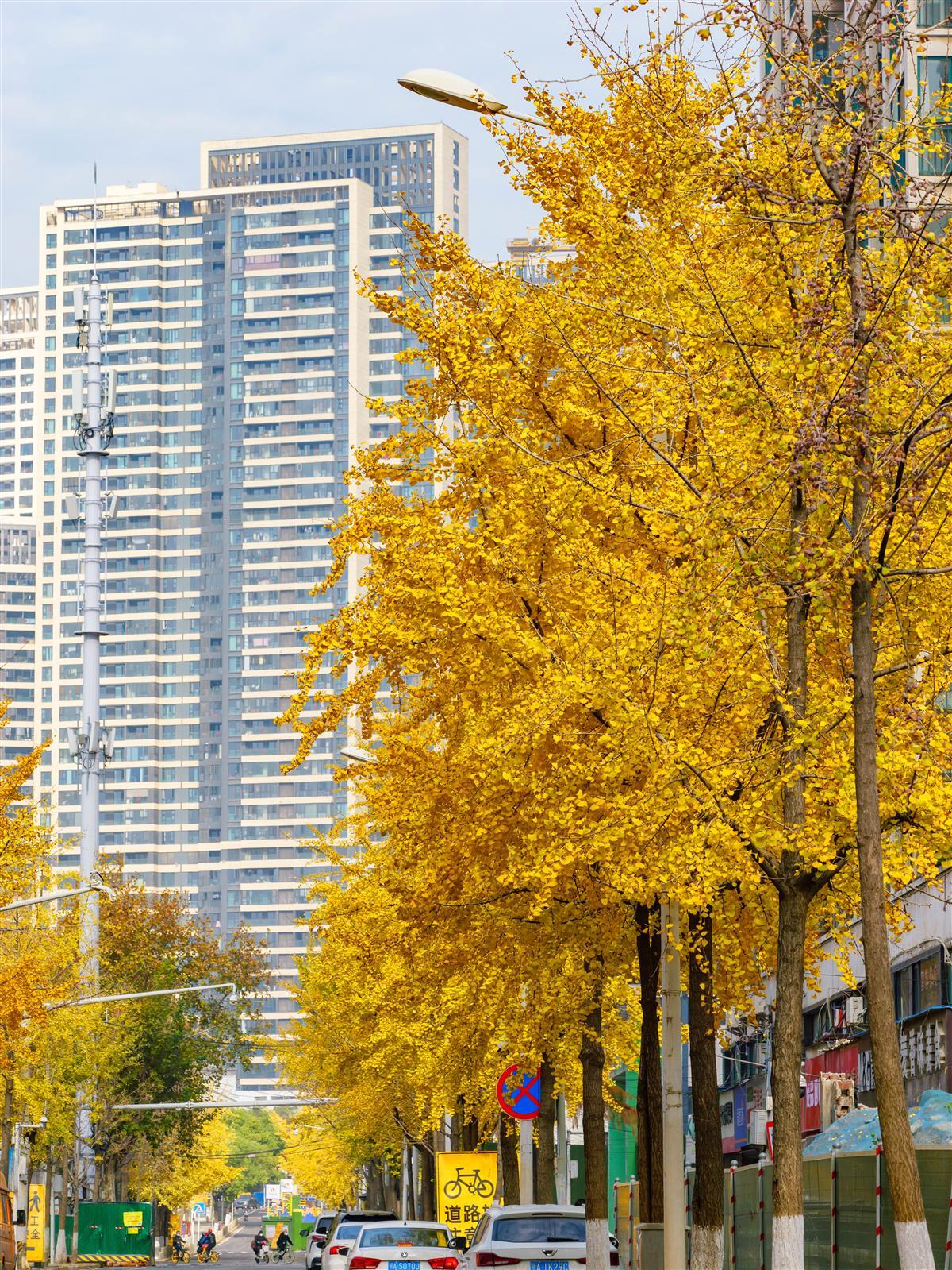 12月15日,在汉阳归元寺路两旁,数十棵银杏树笔直伫立着,枝头挂满金黄彩条,错落有致。微风吹过,扇形的叶子飘洒而下,如漫天飞舞的金色蝴蝶。