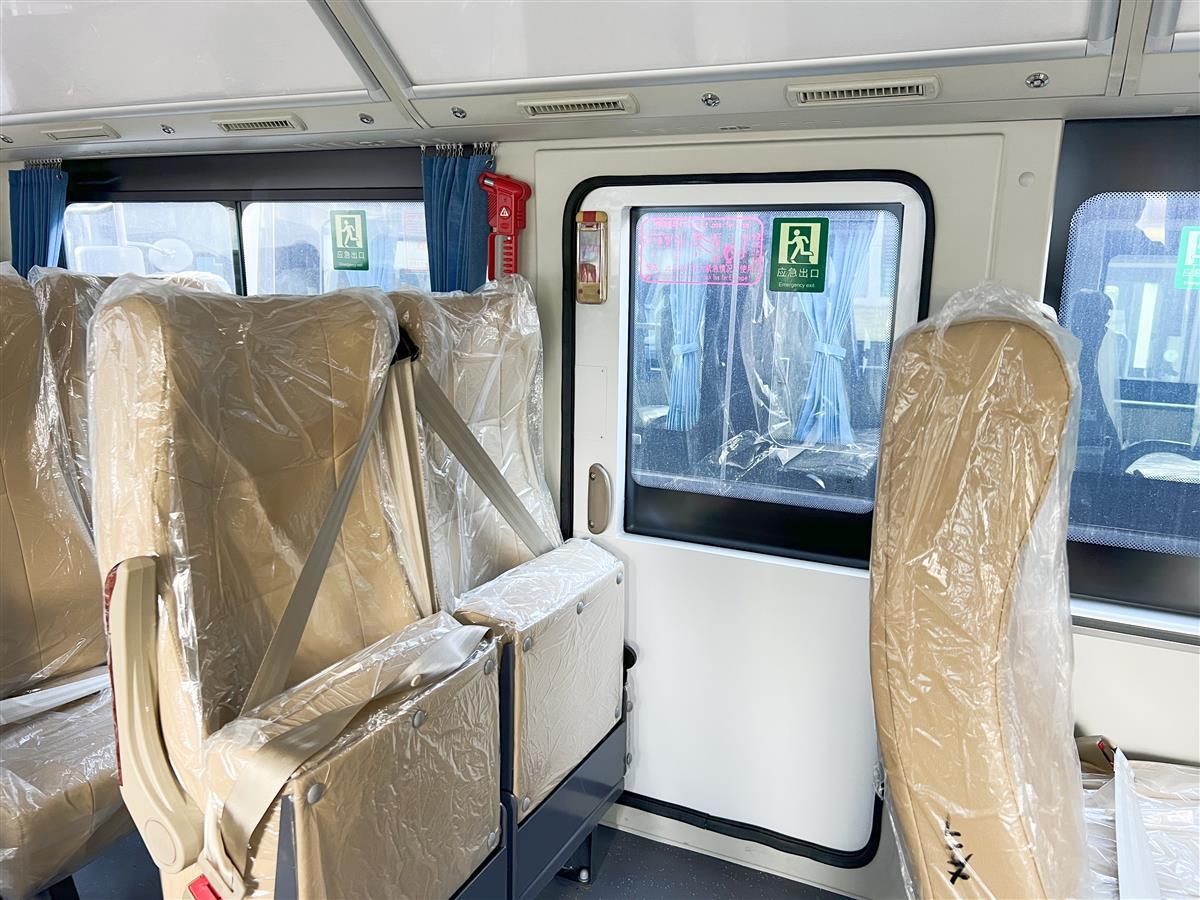 该款车的车厢内除了装置投币机、IC卡机、易燃易爆物品检测仪等常规设施外,还配有车身升降系统、360度环视系统和电加热后视镜等先进的智能辅助设施。在安全设施方面,除了座椅安全带、安全扶手,还在配有传统安全锤及爆玻器的基础上,车身左侧新增了安全逃生窗及安全逃生门,大大提高了乘车舒适度及车辆安全系数。