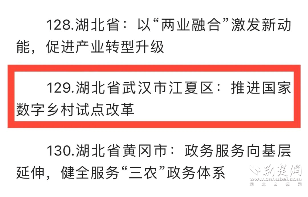 1月3日,“中国改革2022年度地方全面深化改革典型案例”名单公布,作为全国117个国家数字乡村试点区县,武汉市委网信办组织推荐的武汉市江夏区是唯一入选全国年度地方改革典型案例的国家数字乡村试点地区。