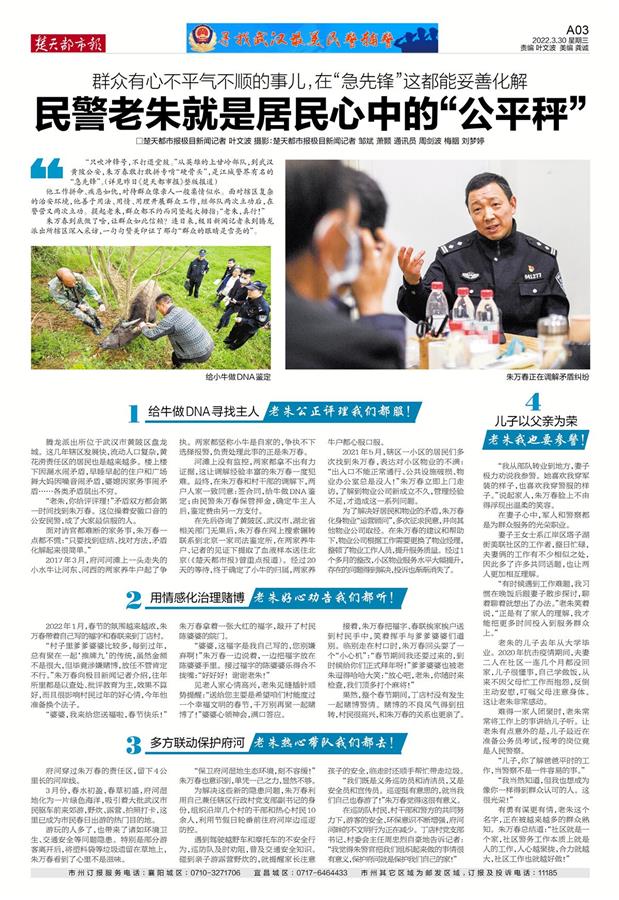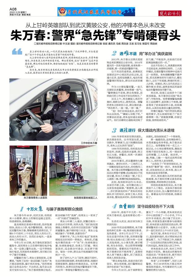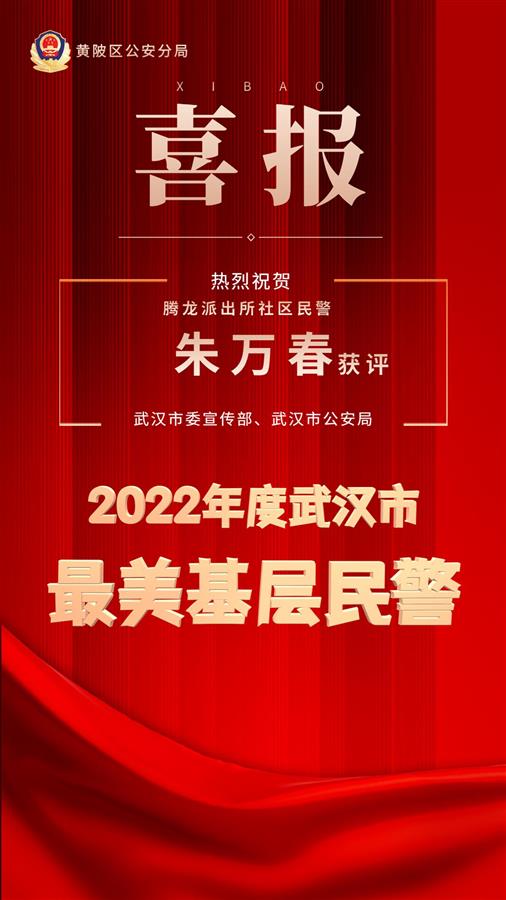 日前,楚天都市报极目新闻记者从武汉警方获悉,黄陂公安腾龙派出所社区民警朱万春被武汉市委宣传部、武汉市公安局授予“2022年度武汉最美基层民警”荣誉称号。