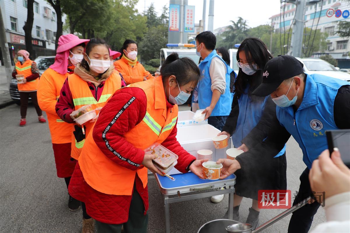 1月5日,武汉新洲区邾城街60余名环卫工人都收到一份爱心盒饭,里面有手撕包菜、千张炒肉丝、胡萝卜炖鸭腿,还有紫菜蛋汤,现场香气扑鼻。吃着可口的饭菜,环卫工人们脸上露出开心的笑容。