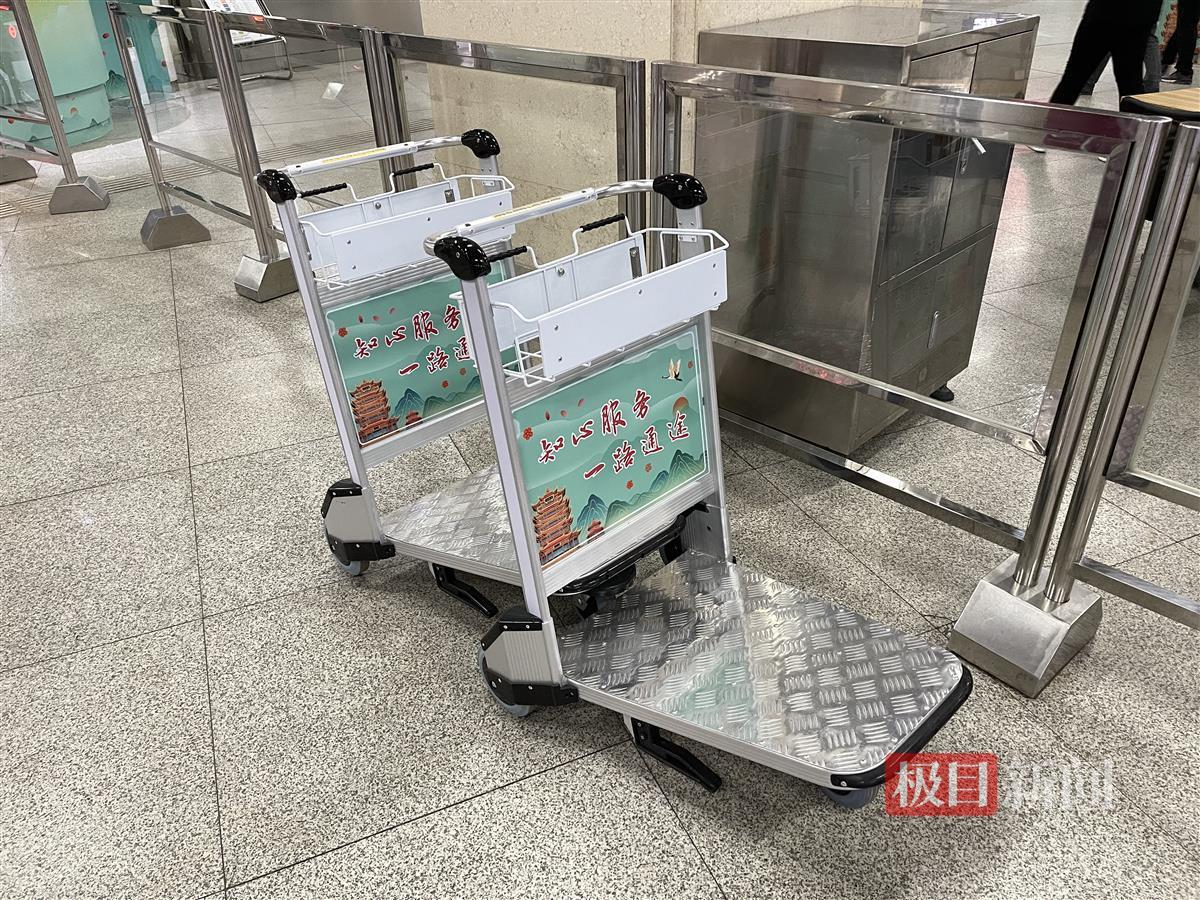 在姚婕服务站附近的通道旁,摆放有2辆全新的小推车。“这个和机场里的小推车是同款,遇到行李物品比较多的乘客,用这个就方便省劲多了。我们可以帮乘客推送至火车站,也可帮他们推送行李至地铁站内直至到站台上车。”值班站长涂莹介绍。