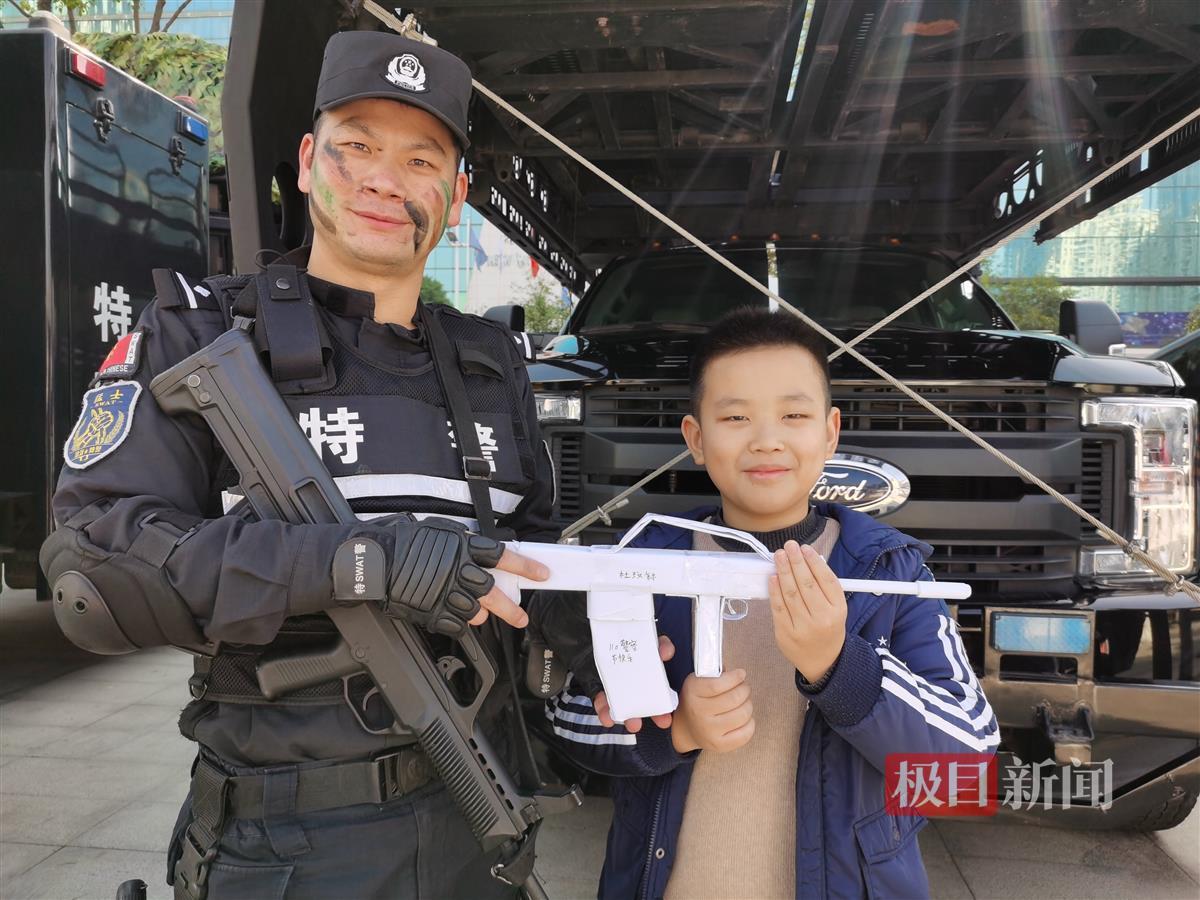 民警没想到,当天还收到一份特殊的礼物。来自武昌区的小学生小杜同学,带来了自己手工制作的一把纸枪,当场写下祝福语“110警察节快乐。”送给在场的特警队员。