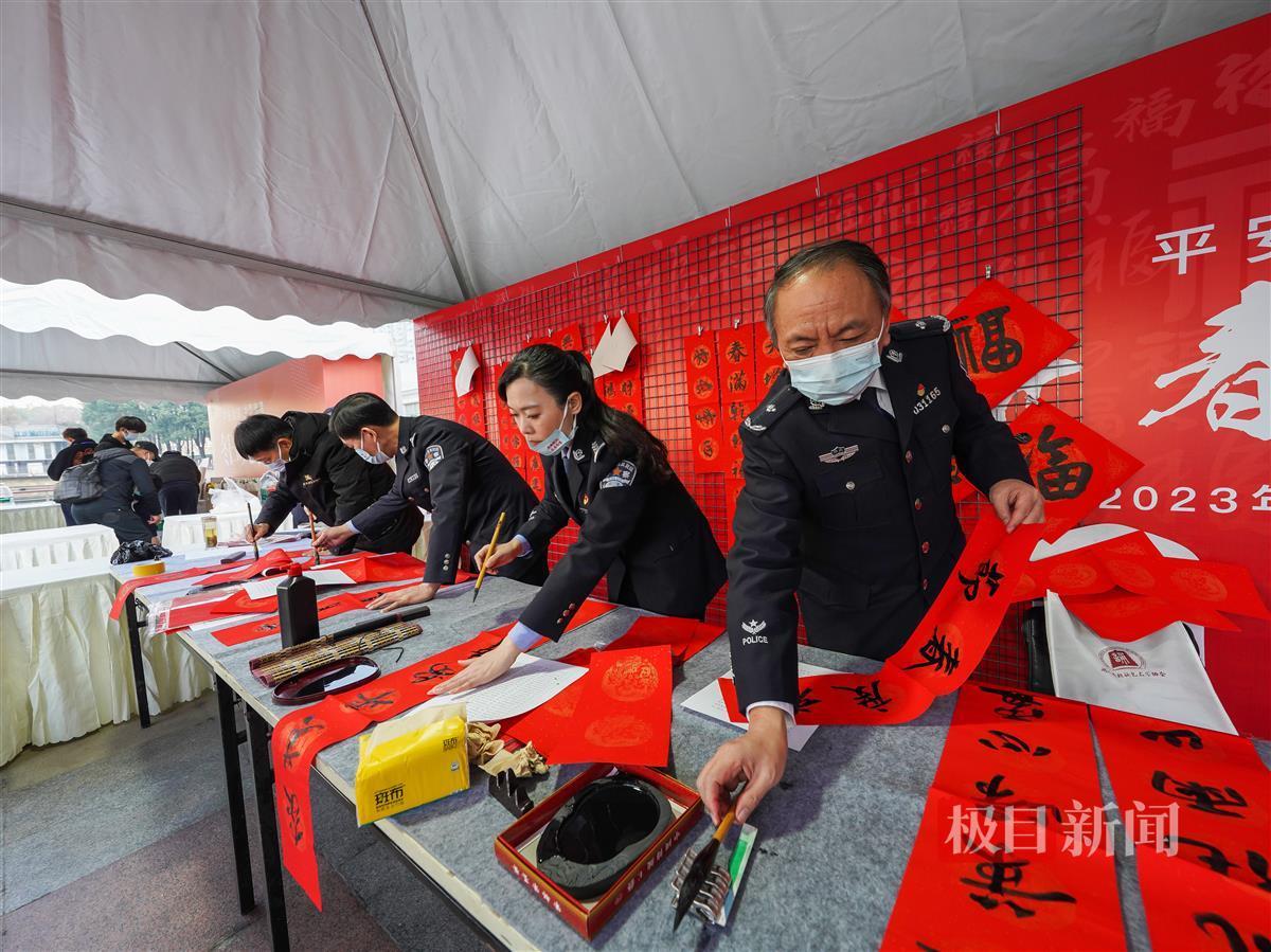 紧挨着“冬日暖心驿站”的,是“新春送祝福区”,这里更加热闹。两顶帐篷里前后摆着两排条桌,10名警营书法家在里面挥毫泼墨,市民们围在前排条桌前等候。“前程似锦创大业 春风得意展宏图”,警营书法家写好一副春联,摆在前面的条桌上,墨迹稍干,就被市民取走,“我要这副”“我要那副”……市民们各取所需。