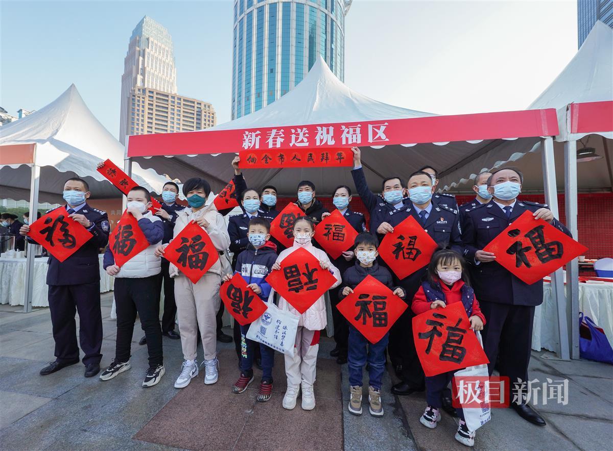 除了现场书写春联,武汉交警还带来了印制的春联福袋,吸引了市民的目光。交警“礼性”十足,同时发放交通安全玩具、警察卡通公仔,还发放印着武汉交警LOGO的抱枕,抱枕打开来就是一床薄被子。