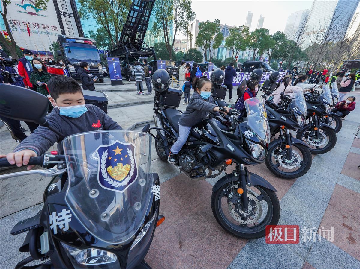 一排闪烁着警灯的汉警快骑和特警快骑十分抢眼。平时穿行在三镇疏导交通、处置各类事故现场的快骑队员们,穿着一身帅气的快骑服,耐心地给现场市民讲解,并把小朋友们扶上摩托车亲身感受。