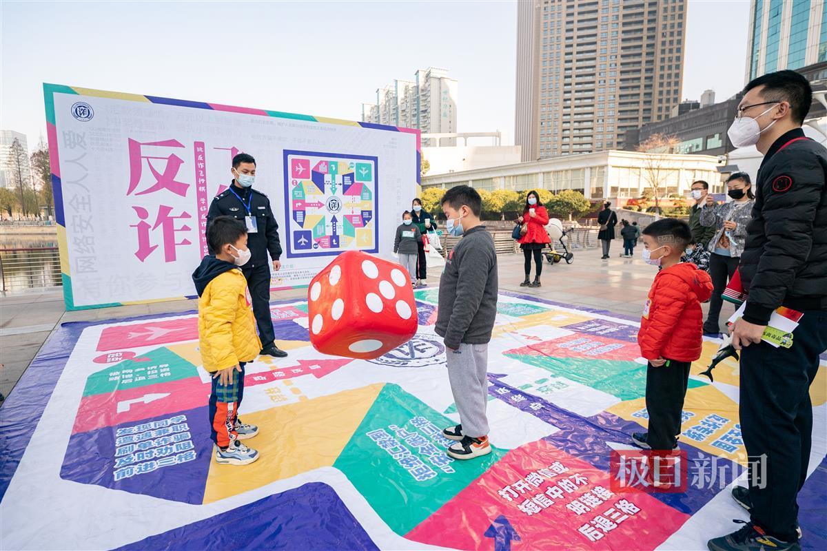 民警还带来了“反诈飞行棋”,几名小朋友踏上棋盘,家长掷出巨大的骰子,“向陌生网友转账,后退三格”“不在非官方网站透露个人信息,前进三格”,孩子们以身体为棋子,玩得兴致勃勃。