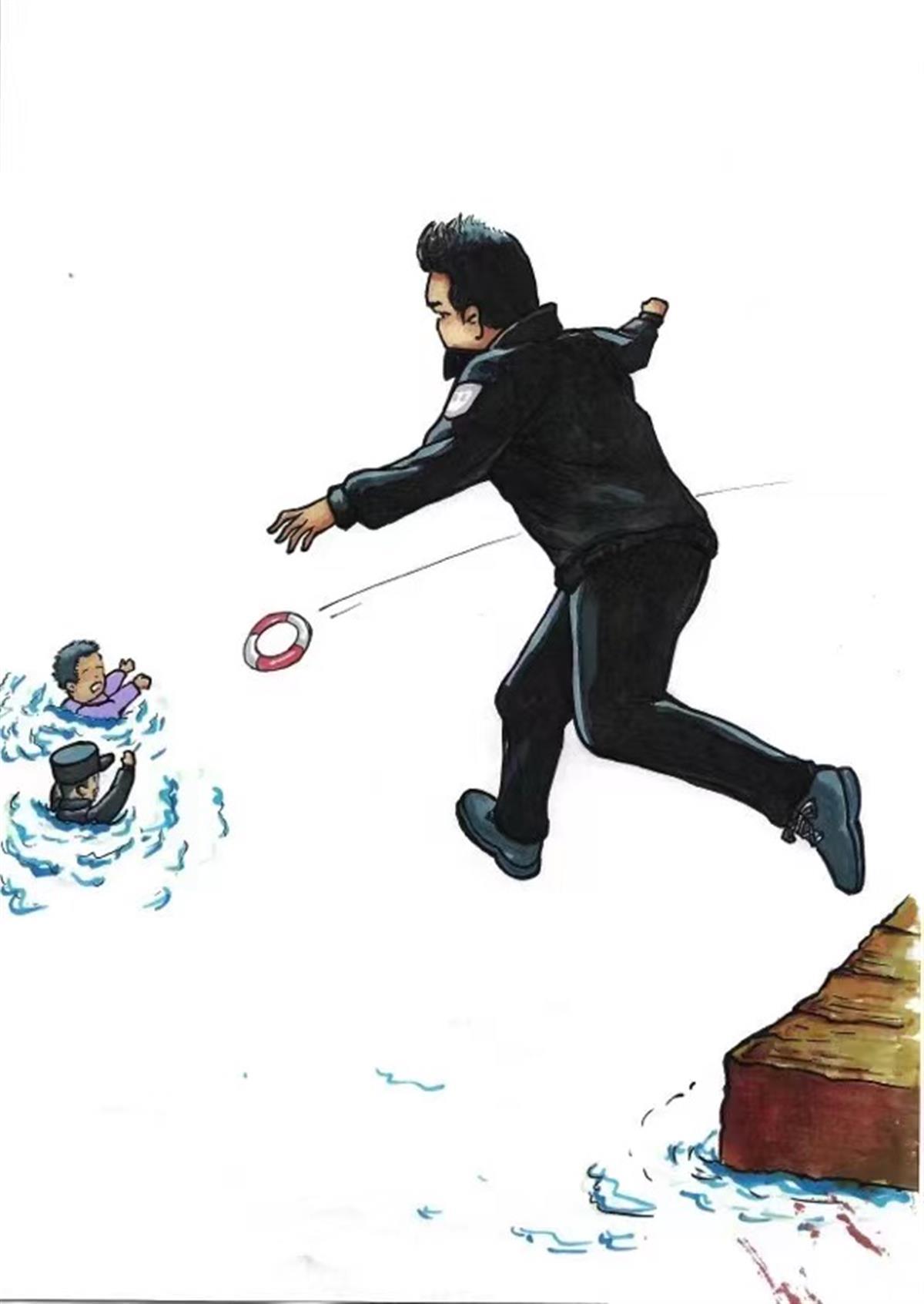 漫画中,只见民警扔下救生圈,一跃而下,跳进冰冷的湖水中,救起落水轻生群众。定格感人瞬间,致敬人民警察。1月10日,第三届中国人民警察节,武汉东西湖辅警李唯用手绘漫画定格警察跳水救人、勇闯火海等感人瞬间,以此庆祝警察节。