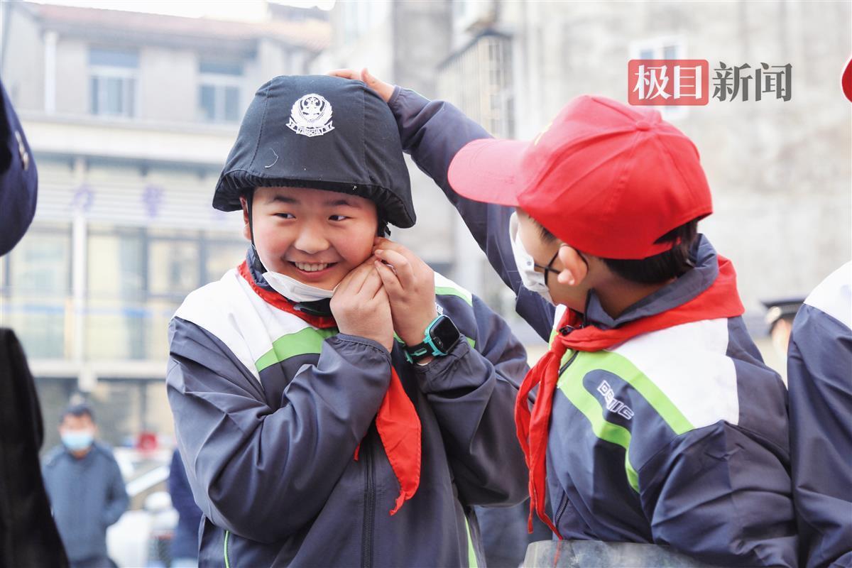 孩子们激动地登上了警车,佩戴了防爆头盔、穿上了防弹背心,近距离体验了一把警营生活。“原来警察叔叔们出警要带这么多东西,当警察真的不是件容易的事。”五年级的郑景浩同学摸着民警身上的单警装备,不禁感叹。