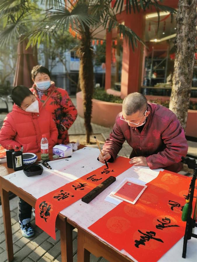 义写春联服务,则给居民带来喜气和祝福。社区书法社的刘师傅在活动现场挥毫泼墨,按居民需求写下一副副火红喜庆的春联。他不仅送春联,还送“福”字,让社区年味更浓。