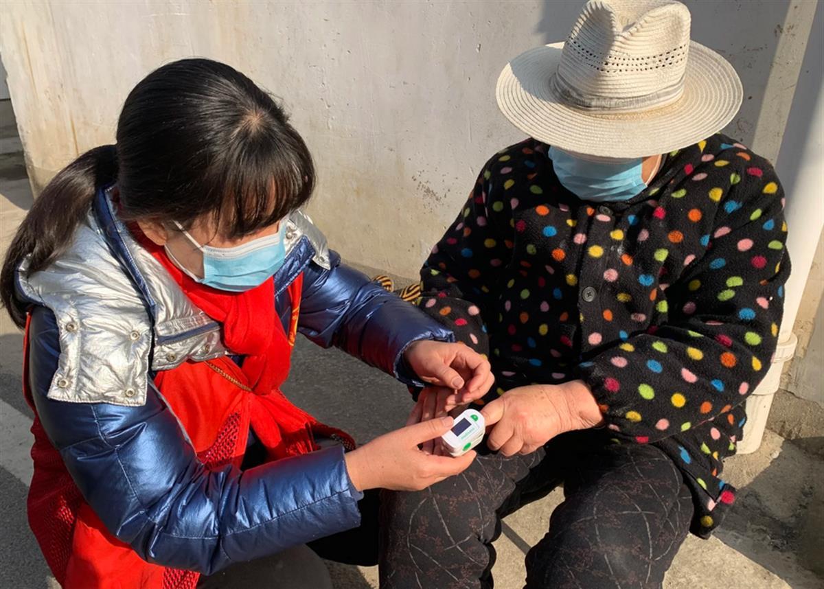 志愿者为老年人检测血氧饱和度