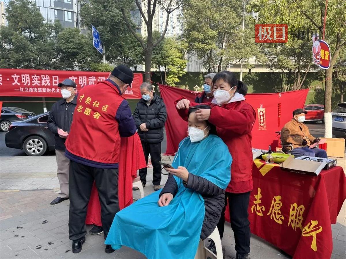 非物质文化遗产传承人朱红彦师傅现场为居民们表演吹糖人绝活,吹出来的物品栩栩如生,深受青少年喜爱。一位刚从外地返乡的杨女士带着长辈来理发,她接过志愿者送上的对联和福字说道:“谢谢你们送的‘福’字,这次回家感觉暖到心里去了!”