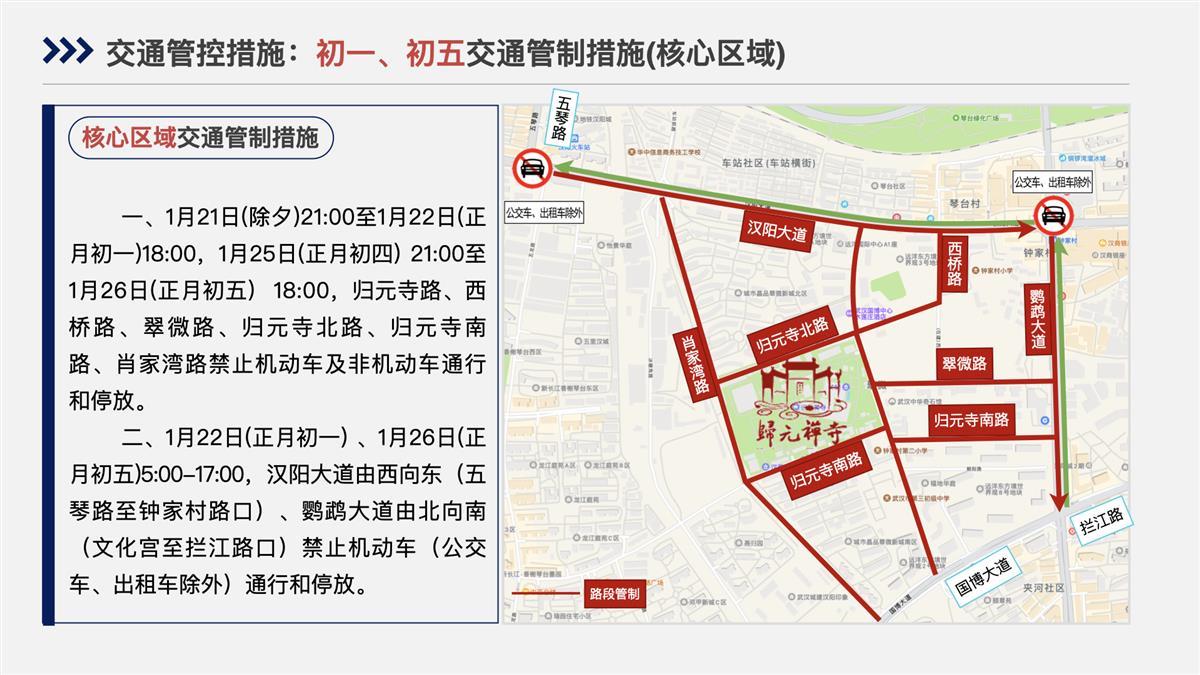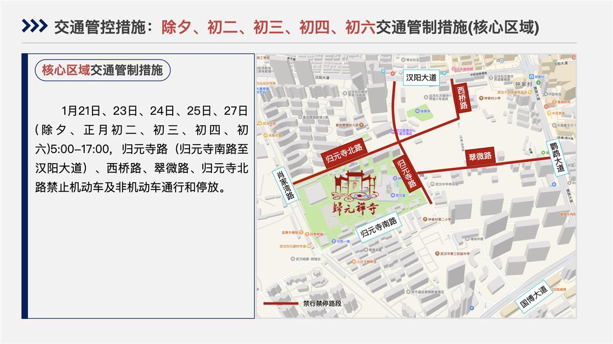 春节期间,交管部门将对归元寺周边部分道路进行交通临时管控,具体管控措施如下: