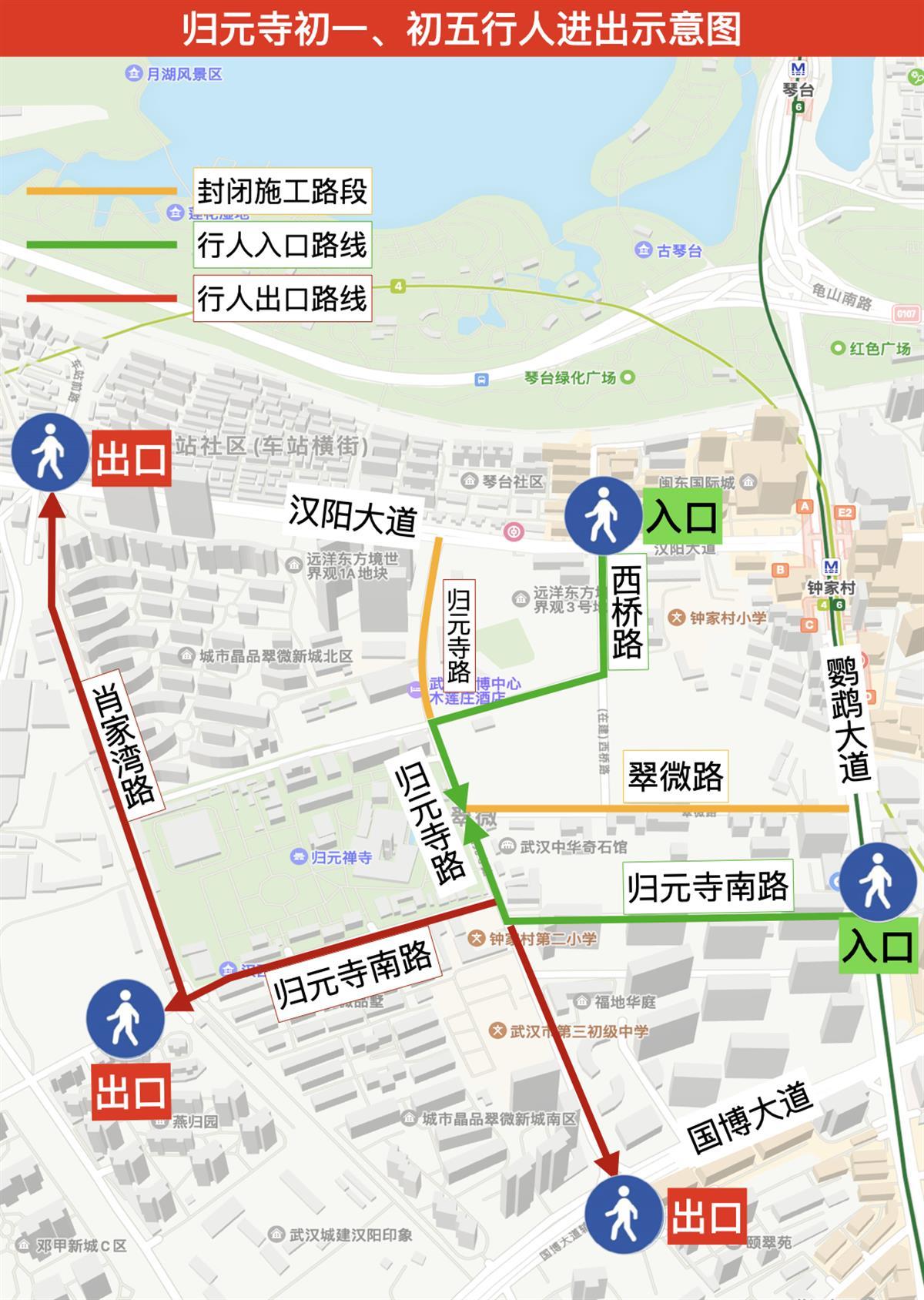 四、1月21日、23日、24日、25日、27日(除夕、正月初二、初三、初四、初六)5:00-17:00,归元寺路(归元寺南路至汉阳大道)、西桥路、翠微路、归元寺北路禁止机动车及非机动车通行和停放。