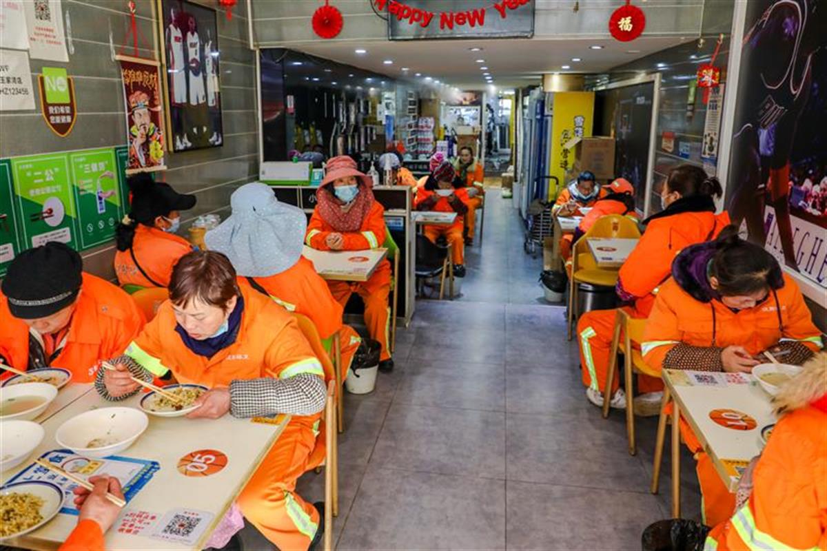 午餐后,环卫师傅们在店内休息片刻后,便赶往各自岗位工作。