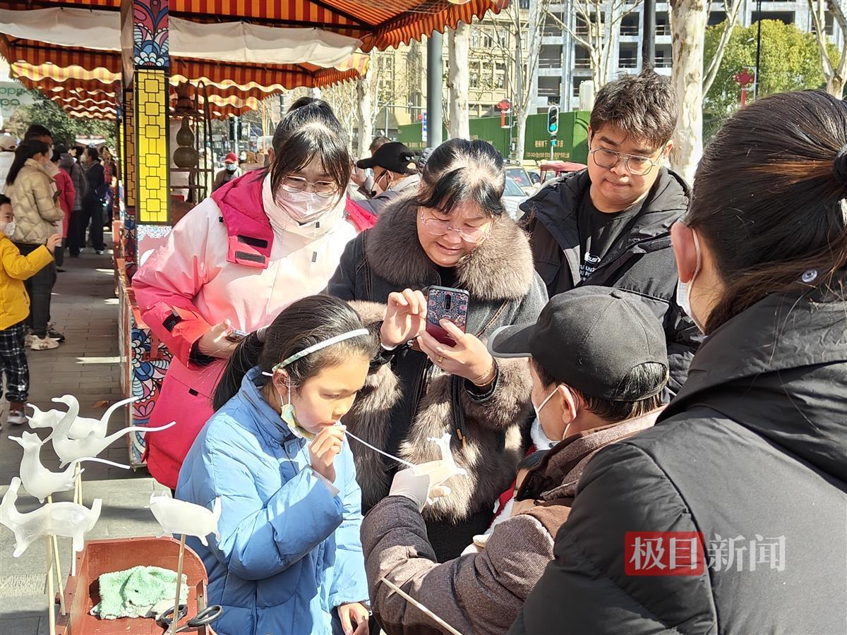 这个春节,6岁的朱怡铉小朋友和父母以及叔叔一家共8人特意从广州来到武汉过节。来吉庆街逛展时,她很快就被吹糖吸引,在师傅手把手的指导下,现场吹出了一只“大象”。她告诉极目新闻记者,自己从来没有见过吹糖,感觉特别神奇,“这个‘大象’我要带回去给同学们看,告诉他们这是我自己‘吹’出来的。”