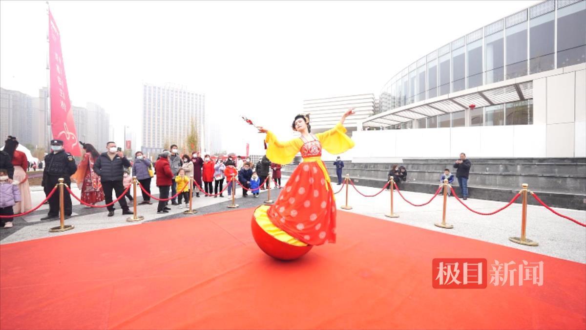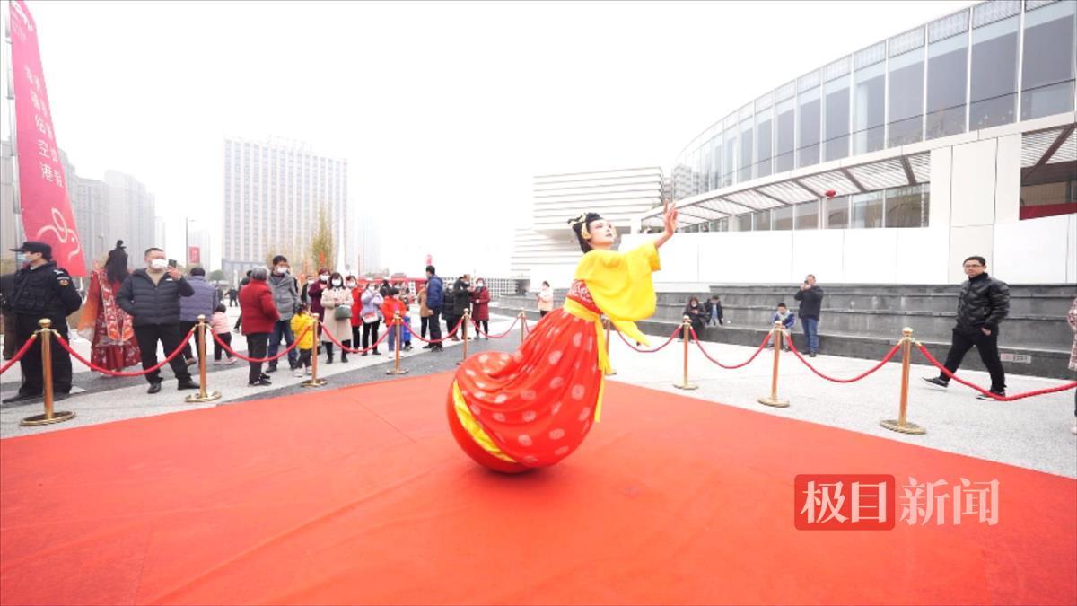 当天上午10时许,一位身穿精美唐装,化着精致妆容的女孩刚刚亮相,便吸引了众人的目光。她走到临空港文化中心的中央广场,站在了一台红色的底座上,手持罗扇,与市民互动起来,化身火爆全网的“不倒翁小姐姐”。