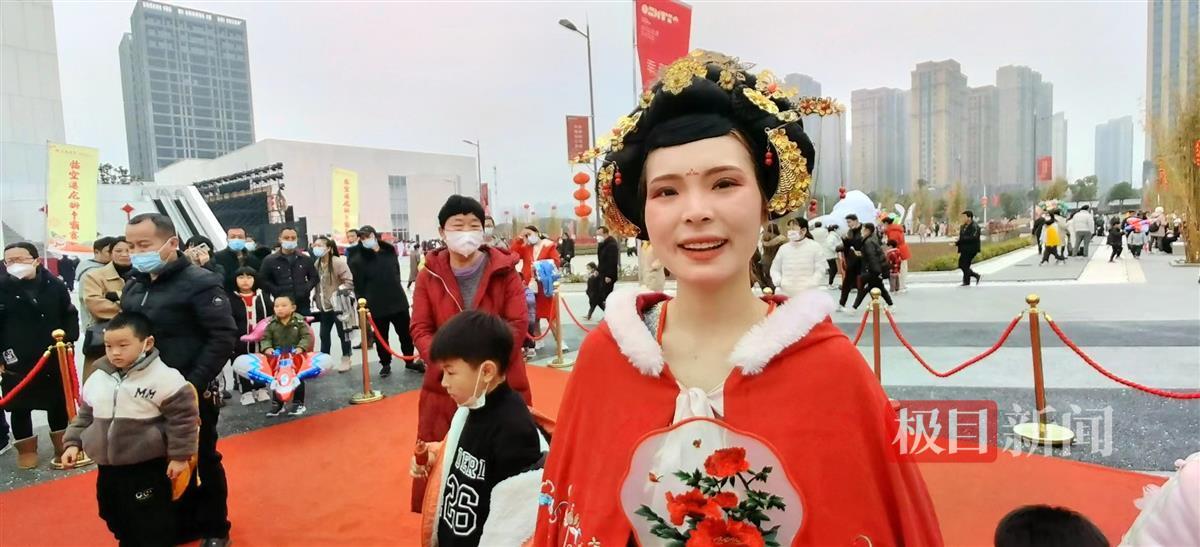 庙会活动现场,设有文化美食非遗市集、朝代传统服饰展示秀、不倒翁表演、音乐剧演出、22个民俗文化体验活动等系列节目,吸引不少市民前来游玩。