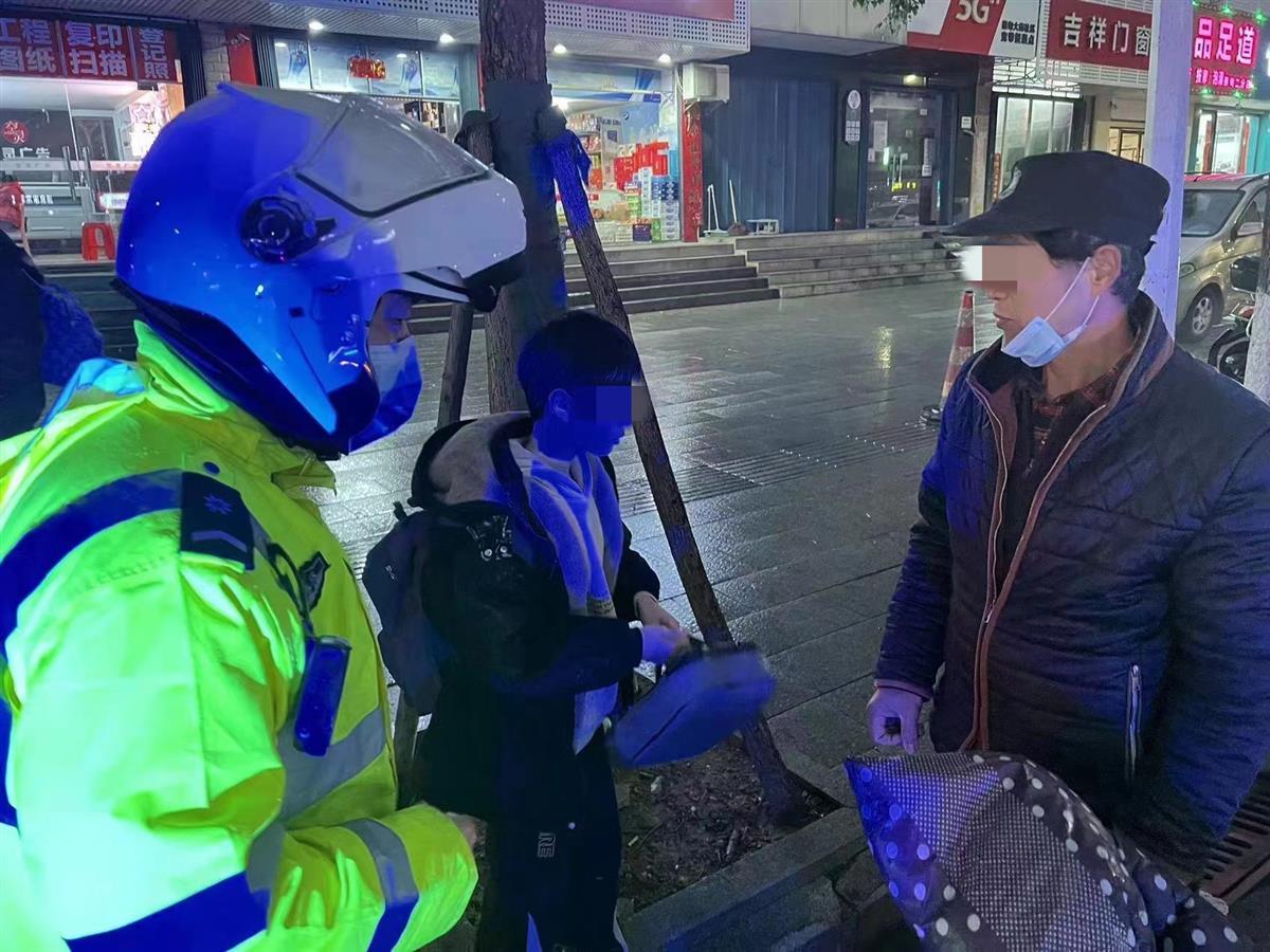 2月8日18时许,蔡甸区交通大队汉警快骑机动队队员谢奕枫、叶星星正在蔡甸大街汉阳一中附近路口执勤时,一位老人疾步走到他们跟前,焦急地说:“我来接孙子放学,但是现在找不到他了。”