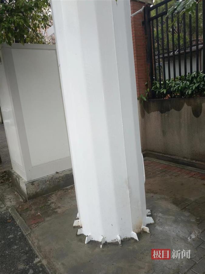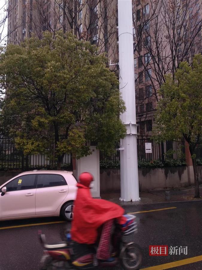 2月10日,在许先生的指引下,记者来到橡树湾二期三号门附近,见到了他口中这座“一夜而立”的铁塔。该塔距离小区出入口约20米远,塔高约30米,整个铁塔为白色,铁塔基座为多边形,塔身主要是圆柱形,铁塔顶端每隔约2米有一个铁环,整个铁塔看上去非常像某种信号发射塔。