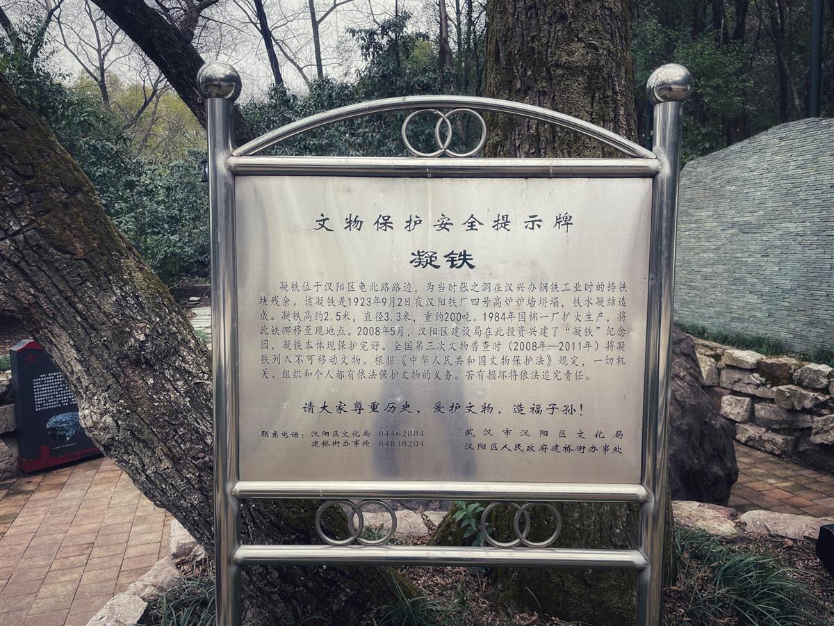 相关文献显示,该凝铁是1923年9月2日夜汉阳铁厂四号高炉炉墙坍塌,铁水凝结造成。凝铁高约2.5米,直径3.3米,重约200吨。1984年,武汉国棉一厂扩大生产,将此凝铁挪移至现地点。2008年5月,武汉市汉阳区建设局在此投资兴建了凝铁纪念园。目前,凝铁本体保护完好。全国第三次文物普查时(2008年一2011年),将凝铁列入不可移动文物。