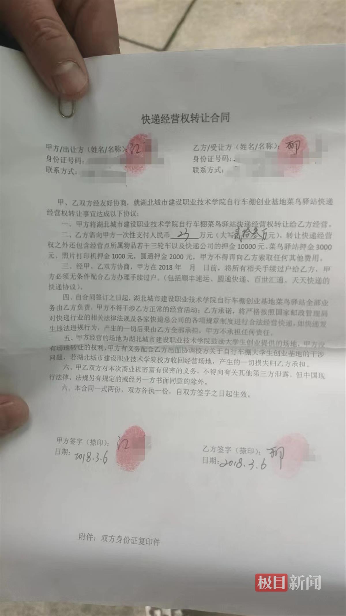 2月17日,柳女士联系极目新闻热线反映称,2018年3月,她和朋友准备做快递经营,联系在湖北城市建设职业技术学院内经营菜鸟驿站的江先生,花费23万元在其手中购买菜鸟驿站的店铺和经营权。在与江先生签订购买协议按了手印后,柳女士将店铺接过来经营。