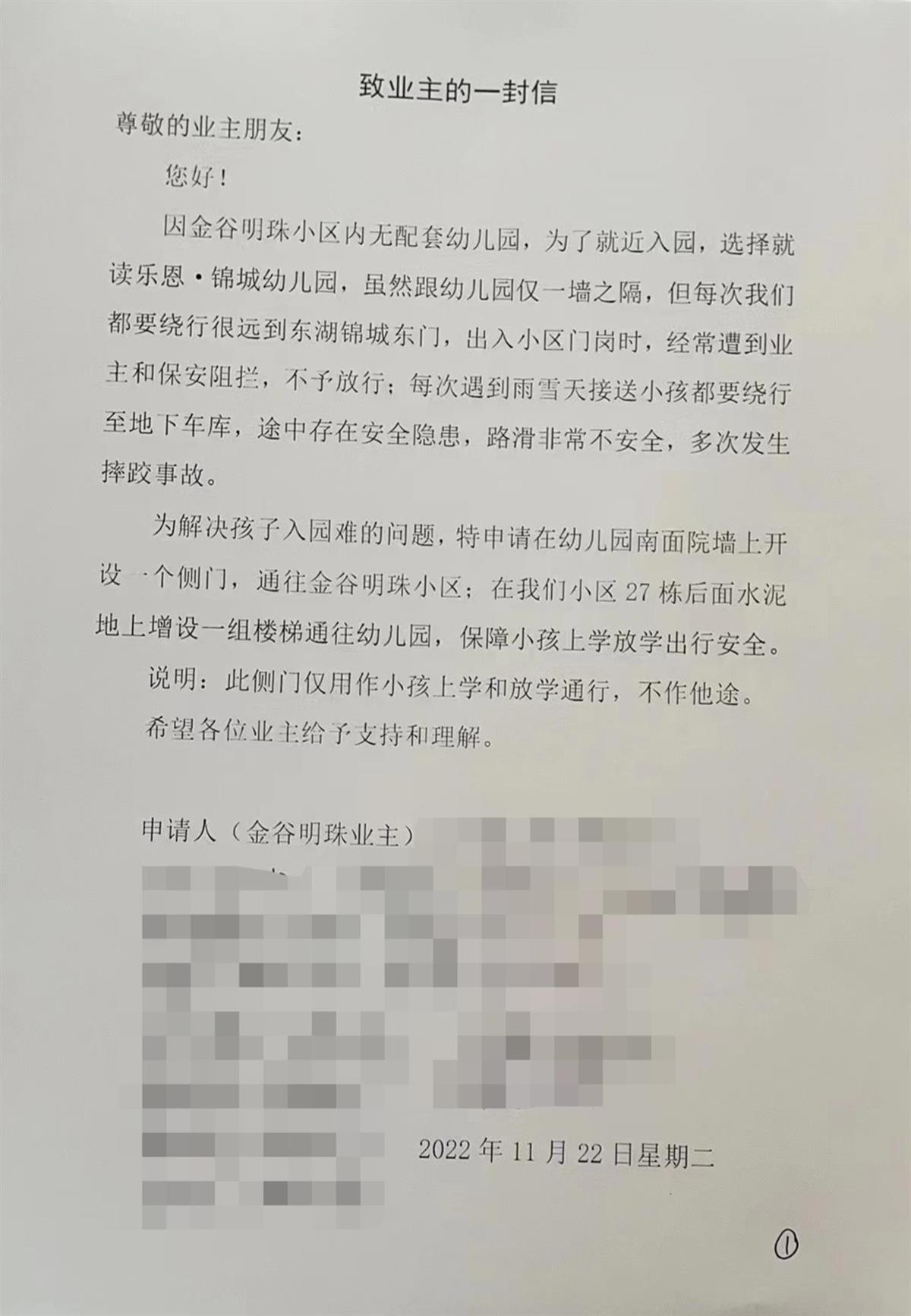 记者还了解到,隔壁小区金谷明珠的业主曾在去年11月份给东湖锦城小区的业主写过一封公开信。金谷明珠的业主在信上表示,考虑到孩子上学放学出行的方便和安全,才开了这个侧门。信上写着:“因小区内部无配套幼儿园,故就近选择乐恩·锦城幼儿园,入园需绕行且经过门岗时常被阻拦,因此申请在幼儿园南面院墙开设侧门,方便孩子上学。”该公开信上还说明,此门仅作小孩上学放学之用,不作他途,并随信附有十几位家长的签名。