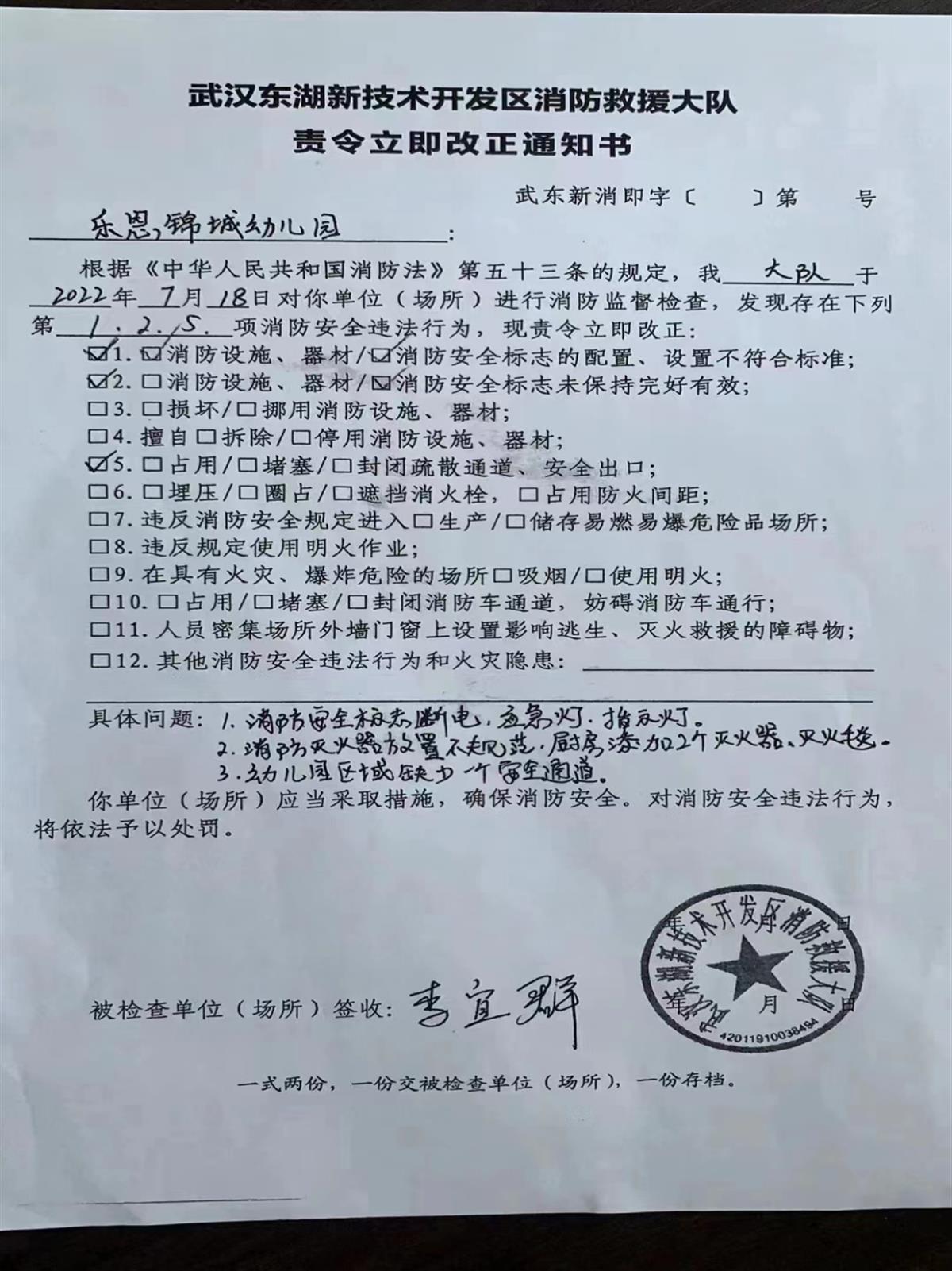 幼儿园提供的消防整改通知书